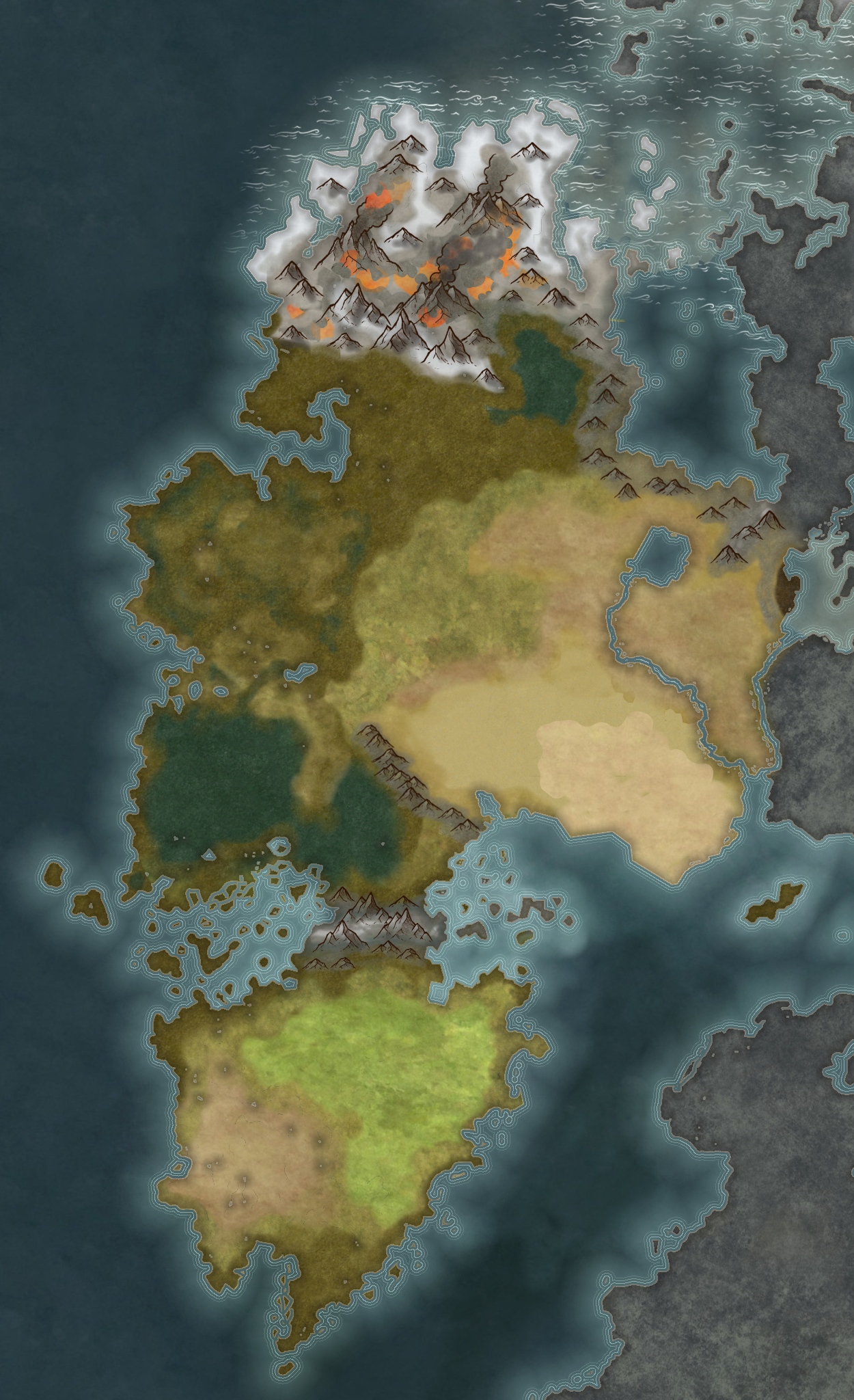 "You may ask how He Who Led Us knew this land was our destined home. The answer is simple. From the moment we set foot upon it, it has tried to kill us. What better proof could there be?"- He Speaks Painful Truths, Duom’keth of Makhaansor Taiki'hasArcesia is a continent shaped by extremes, where brutal natural forces and lingering supernatural influences intertwine to forge a land of relentless motion and conflict. Vast deserts blister beneath merciless suns, fertile plains surge with life and bloodshed in equal measure, and swamp-choked lowlands rot beneath perpetual storms. The towering mountainous wall known as Vhaal’ghan-muon’uurn severs regions from one another, while volcanic highlands quake beneath ceaseless eruptions and ashfall. Ghan’fuort, the "King of Rivers", supplies countless waterways across the continent like a vital artery, fed by the unimaginably immense lake Tai’fourn, eventually flowing into marsh basins and trade routes before spilling into the hostile Pugnausean Sea. Along its coasts, jagged cliffs and storm-lashed shores give way to islands hardened by salt and war, while deep jungles and forests near the Feygate Sanctuary of Shaenunllyenez pulse with untamed magic, warped flora, and creatures born of primal or otherworldly influence. Across Arcesia, megafauna roam in herds or hunt from sky and sea, and ancient powers seep upward through soil and stone, reminding all who dwell there that the land itself is not merely inhabited, but awake, watchful, and unforgiving.