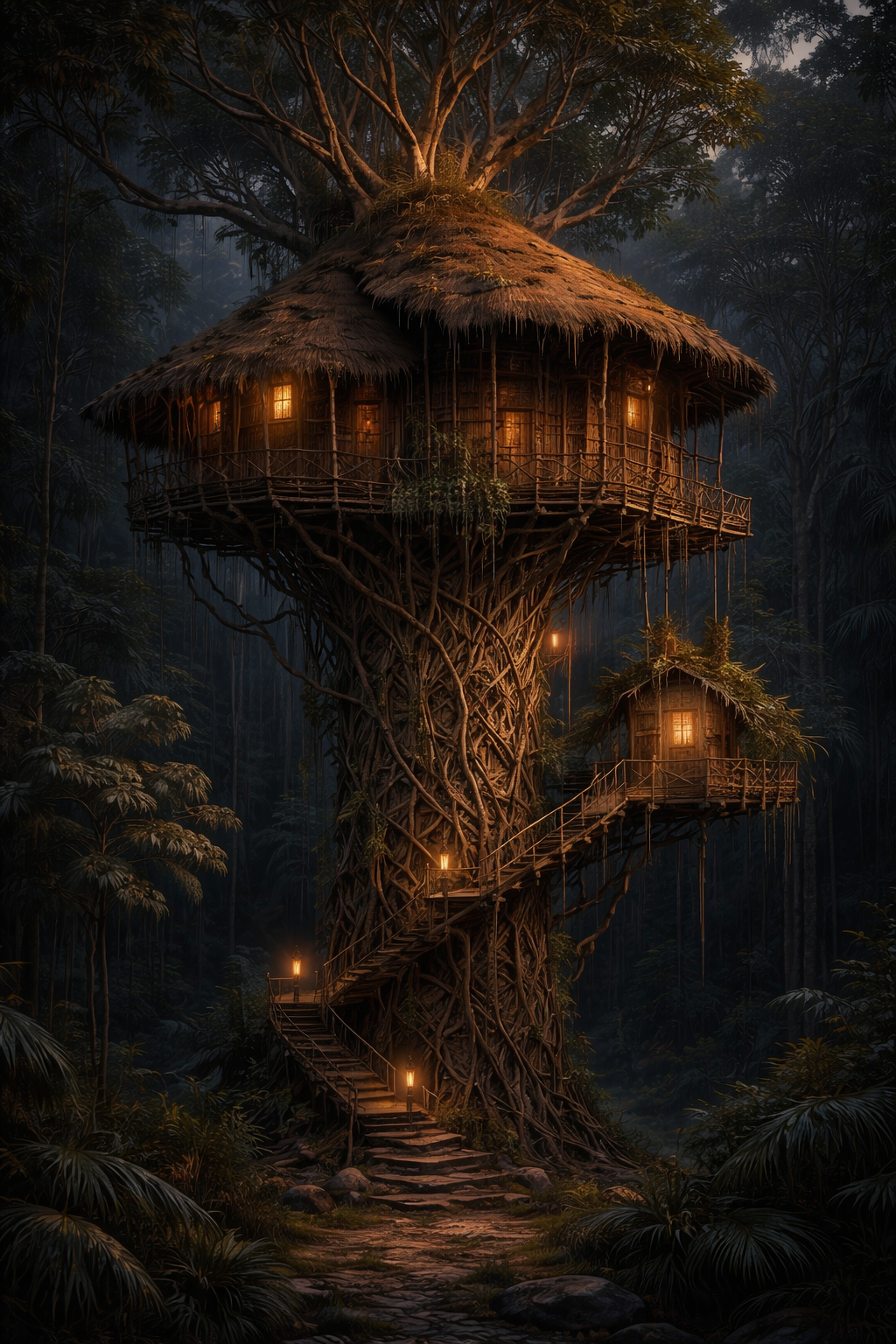 The housing of the Angwusi is built to serve its function as a shelter for a limited amount of time, and then be moved on from. While these constructions are sturdy and serve their purpose well, once the resources of the immediate area begin to dwindle, they will pack up their belongings and move to the next location, leaving the treehouse where it is and allowing it to fall into disrepair, any of the pieces of it that fall away considered a return to the place from whence they came. Each return to one of the locations lived in prior are repaired easily enough and living in that place resumes. Through this cyclic and nomadic manner, each familial unit's territory is allowed to regrow and replenish resources wile away. Each unit will cycle between several of these locations.