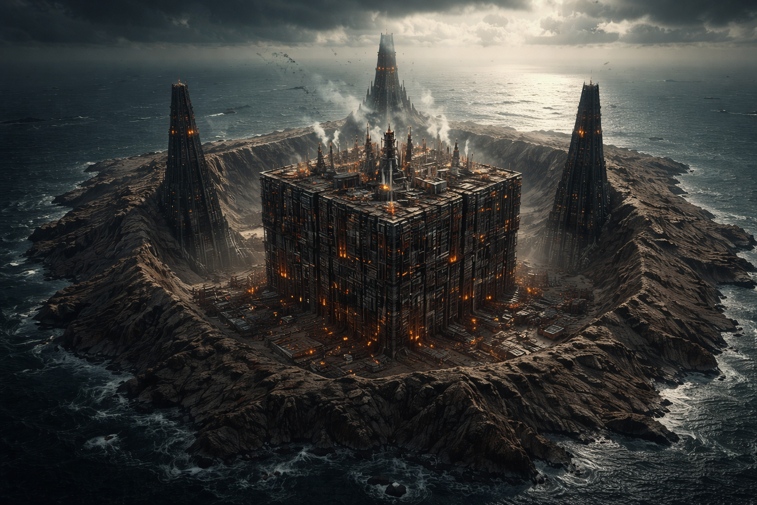 This is home to the enigmatic species known as the Bonedancers . The island, while not large, is imposing all the same. It is a barren, stone outcropping sitting in a remote part of the ocean, far removed from the mainland. It is dominated by a sprawling city called Obficina that consists of interconnected factories and industrial buildings topped by numerous giant smokestacks that constantly bellow smoke, steam, and other chemical elements into the air, making the location difficult to breathe in by visitors, though visitors to the island are very rare.