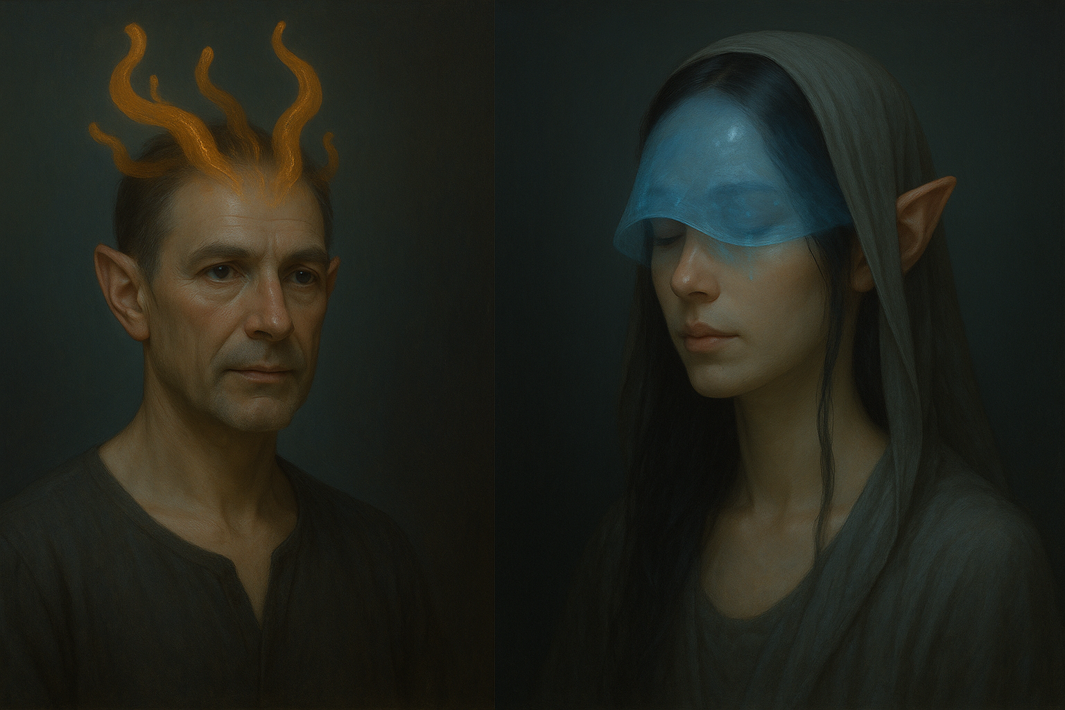 The Luminari are an ancient, reclusive people who evolved far beneath Cairne’s surface during the centuries following the Blight. Their appearance is striking yet serene, softened melanin, enlarged luminous eyes, and areas of natural translucency that give them an almost inner glow. Each Luminari forms a lifelong bond with a bioluminescent symbiotic organism known as a Luminid, which manifests across the face and crown in fluid, living shapes unique to the individual. These manifestations, Crownform, Veilform, Haloform, and Tendrilform, reflect the host’s nature, emotional resonance, and inner strengths.