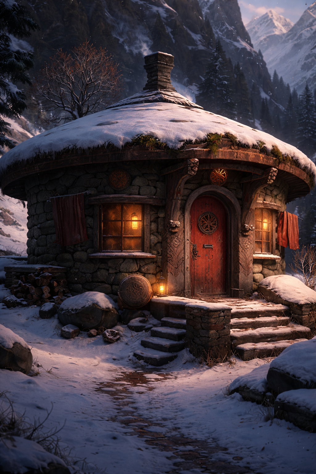The Osomahtin use local materials such as stone, wood, and clay to construct their houses, and also use animal skins or fur to cover the roofs and insulate the walls against the harsh climate. They are designed to withstand the harsh weather and be well-suited to their mountainous terrain. They are built to be low and compact, with flat or sloping roofs to shed snow and water. The houses also have large windows or skylights to let in natural light and provide views of the surrounding landscape.