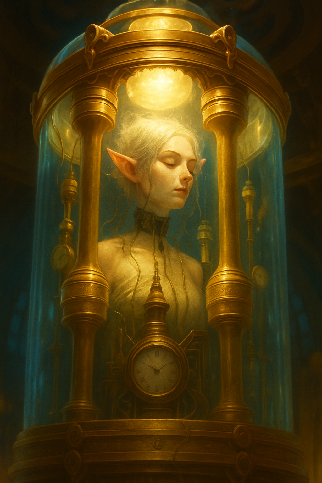 Internally, the structure is a tangle of brass pipes, mechanical gearworks, and thousands of glass containers of all different sizes organized within windowed chambers that are shelved and suspended throughout the vast holding area. In the center of the chamber is a single walkway that leads to a hanging platform upon which rests a central control panel for picking and moving the items within the room. The device itself is a work of art in terms of design, but an unlabeled and extremely complicated series of dials, switches, and levers. There is a constant cold fog that clings to the lower regions of the chamber obscuring the lower quarters for the most part, and the entire structure is sparsely lit by carbon arc lamps.
