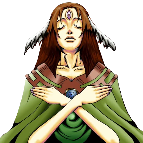 Oltre alle sue Quattro Forme, Genessia talvolta appare in una veste più rara e solenne, conosciuta come la la Dea dal Terzo Occhio. In questa manifestazione, si mostra come una donna dai capelli castani fluenti, il cui sguardo è reso ancora più penetrante da un terzo occhio aperto sulla fronte, simbolo della visione oltre il velo del presente. Due piccole ali bianche poggiano leggere sul suo capo, evocando la purezza del cielo e il legame tra il ciclo della vita e le forze invisibili che lo governano. Indossa un abito verde intenso, il colore della vita nella sua piena maturità, ma privo delle delicate sfumature primaverili o della calda luce estiva: è un verde profondo, carico di significato e gravità.