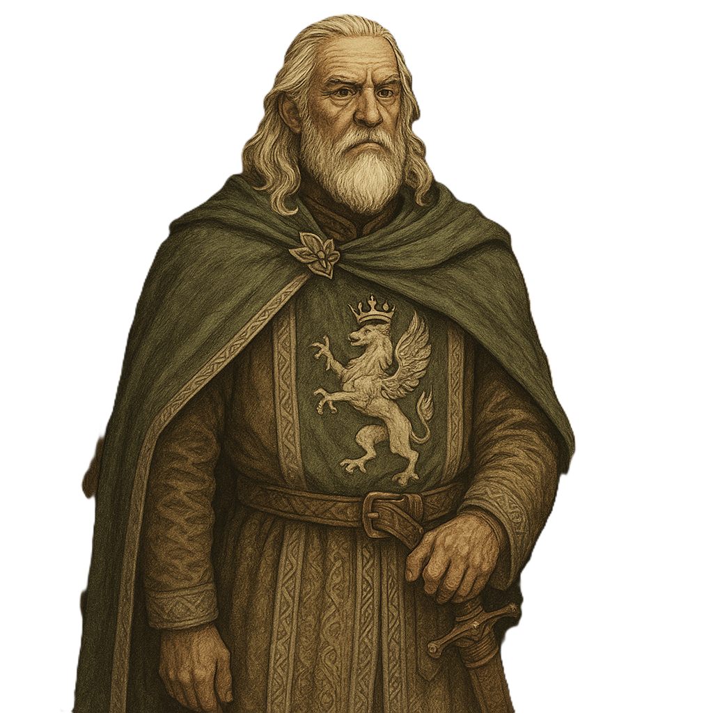 Fiero membro dei Cavalieri del Grifone, ha abbracciato la spada in gioventù e ha continuato a servire, anche dopo la guerra, non solo come nobile, ma come guida morale. La sua fama è di uomo retto, inflessibile con gli ingiusti, ma capace di compassione per i deboli. Odia il lusso fine a sé stesso, vive con sobrietà e non tollera l’arroganza nei giovani nobili, che invita spesso a conoscere la fatica della terra e il dovere del comando.