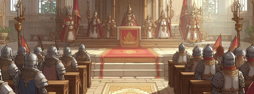 Il cuore spirituale del Presidio è la Sala della Fiamma: una grande navata senza vetrate colorate, dove la luce naturale filtra attraverso sottili feritoie. Al centro della sala arde un braciere perenne, simbolo della fede incrollabile, che viene alimentato giorno e notte dai novizi. L’altare, scolpito nella roccia, è spartano ma solenne, e sopra di esso pende una grande spada cerimoniale, simbolo del giuramento eterno a Gael.