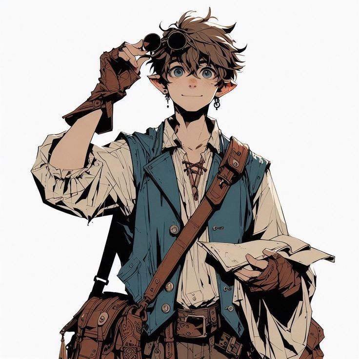 - His attire (as seen in the image) is a blend of traveler and artisan: a vest and belts full of compartments, scrolls, and gadgets, all somehow arranged with chaotic elegance.