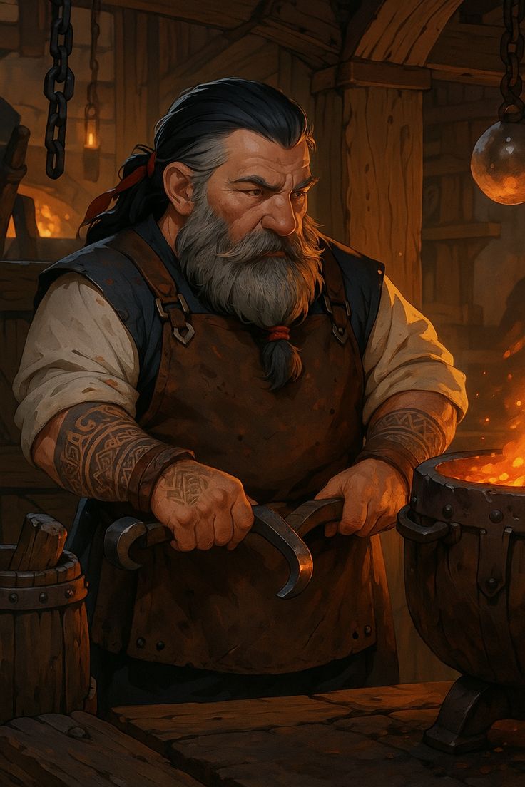 His eyes, once a warm and earthy brown, are now clouding into a pale gray-brown, a slow descent into blindness. The light of the forge still reflects in them faintly, as if the embers of his craft refuse to fade entirely. His hair, still thick and long, is dyed jet black — the color his late wife adored. It’s worn in his signature loop-tail style, drawn down to the small of his back before looping upward and tied to his head with a charred red ribbon — her ribbon, singed during the dungeon raid that claimed her life.