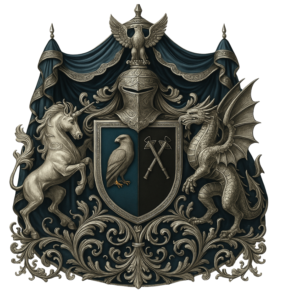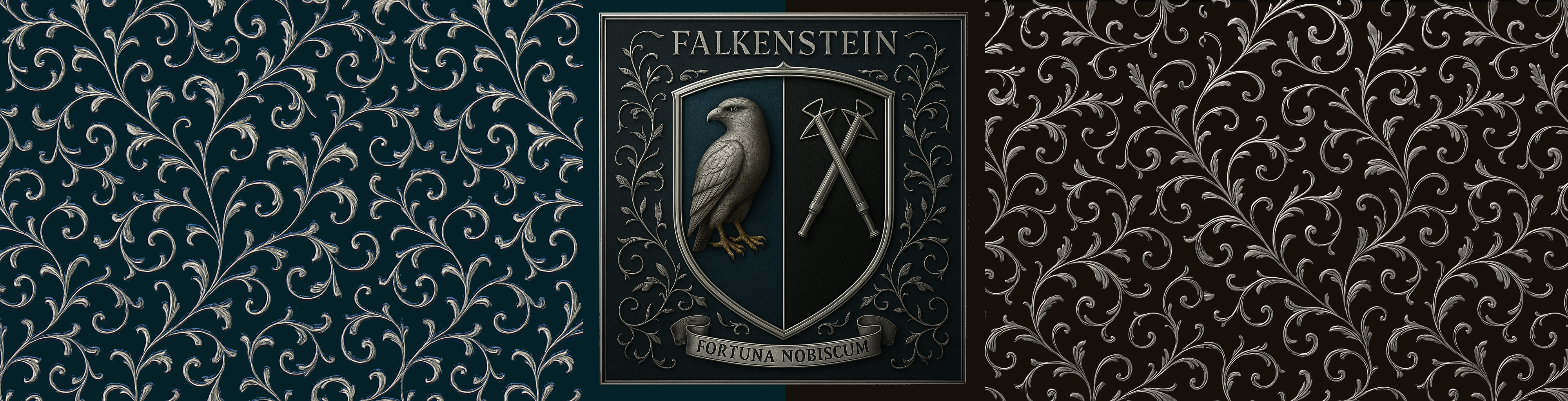Es heißt, wer einst die Hallen von Falkenstein betritt, der erblickt zuerst das Banner des Hauses – geteilt in Himmelblau und Nachtens Schwarz, wie Tag und Dunkel, wie Hoffnung und Pflicht. Im blauen Feld ruht der silberne Falke, stolz, aufrecht, wachsam wie der Geist des Landes selbst. Seine Augen, in die Ferne gerichtet, suchen nicht den Kampf, sondern das rechte Maß –