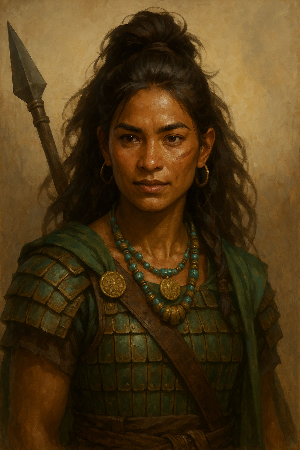 Anjari Jimbo stammt aus der Kokosnussbucht in An-Teng und ist die Nichte des berüchtigten Söldnerführers Borr Jimbo. Sie ist Ende 20, wettergegerbt, von schlanker, wendiger Statur mit sonnengebräunter Haut, geflochtenem schwarzem Haar und einem durchdringenden Blick. Ihre leichte Rüstung trägt Zeichen ihrer Heimat: Muscheln, bunte Tücher und kleine Schnitzereien aus Treibholz. Früher war sie nur eine Offizierin in den Speeren der Kokosnussbucht – einer amphibischen Söldnereinheit, spezialisiert auf Land- und Seeoperationen, bestehend aus Piraten, Küstenkriegern und Dschungelkundigen.