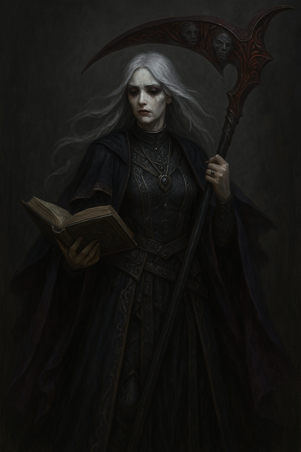 Ihr Name ist in den Schatten verborgen, und sie wird nur unter dem Titel „Dame des Endlosen Leidens“ gefürchtet. In ihren schwarzen Gewändern, die den Tod selbst zu verkörpern scheinen, zieht sie durch das Land, mit der unheilvollen Macht, das Leben aus den Toten zu reißen und sie zu Werkzeugen ihres Willens zu machen. Ihre finsteren Taten zeugen von einer Entschlossenheit, die keine Gnade kennt und ein Ziel verfolgt, das weit über das Verständnis der Lebenden hinausgeht.