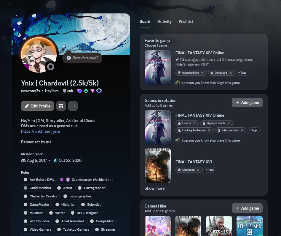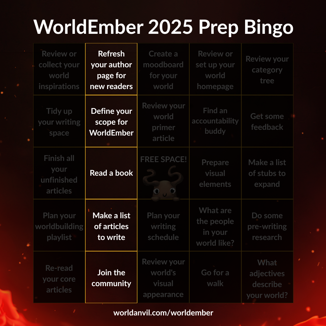 Few things are as motivating as fellow worldbuilders cheering you on! Join the WorldEmber community on our Discord server and introduce yourself! Share your progress and see what others are writing about.Is this one cheating if I've been in the World Anvil discord since 2020? Oh well. Around challenge season, I tend to become more active in the discord anyways, doing stuff like updating my server name to reflect my current word count, posting articles and maps as I finish them, that sort of thing. Otherwise I'm fairly quiet, mostly interacting in the comments of others' articles, liking them, that kind of them. I'm fairly solitary in my worldbuilding, though I've been trying to get more of my close friends onto the WorldAnvil/WorldEmber bandwagon so a bunch of us can compete together!