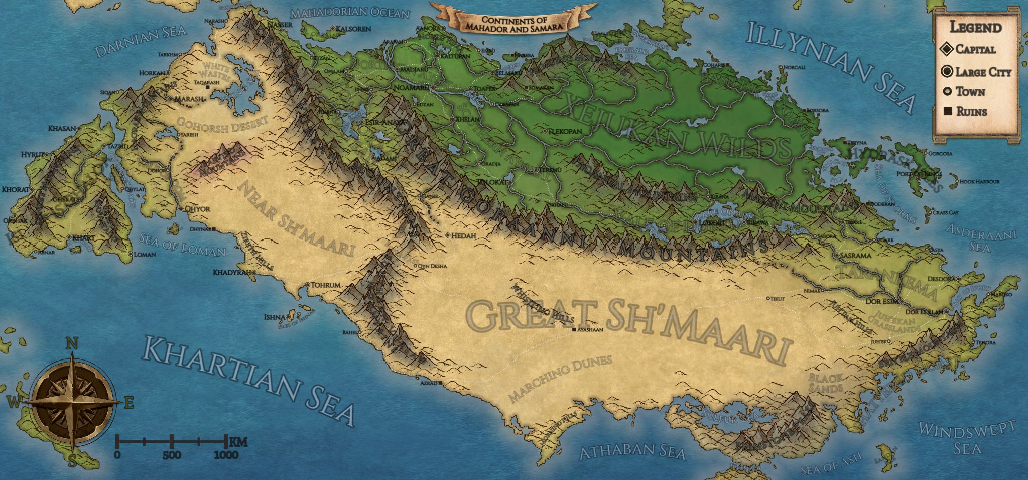 The Samyrian Mainland: Considered a sub-continent of Mahador, Samyria is a largely dry and lightly populated landmass. The coast along the Darnian and Khartian sea is somewhat temperate, composed of grasslands, savannas and even some tropical forests, while the interior is made up of salt flats, sandy deserts and dry mountain ranges, such as the Painted Mountains, famous for their coloured rocks.