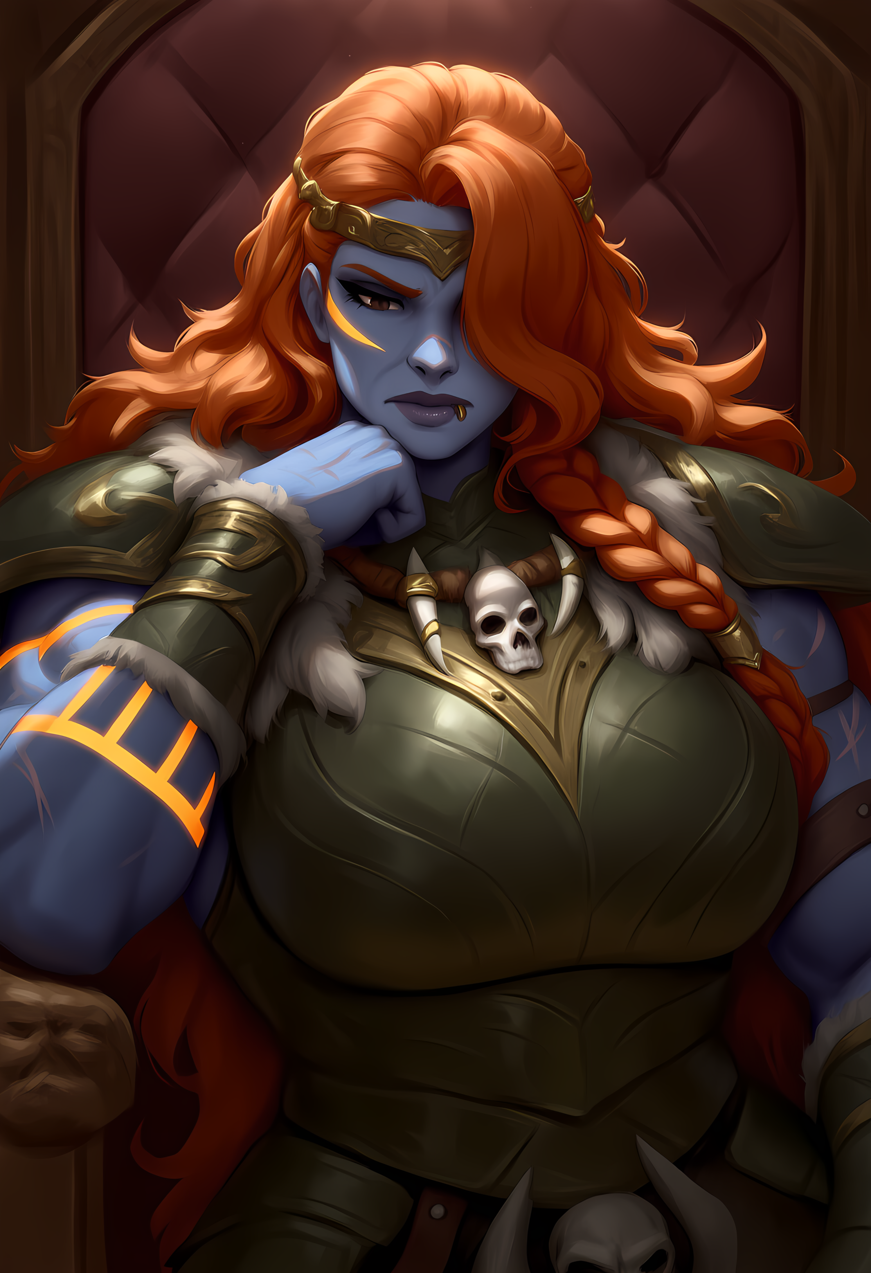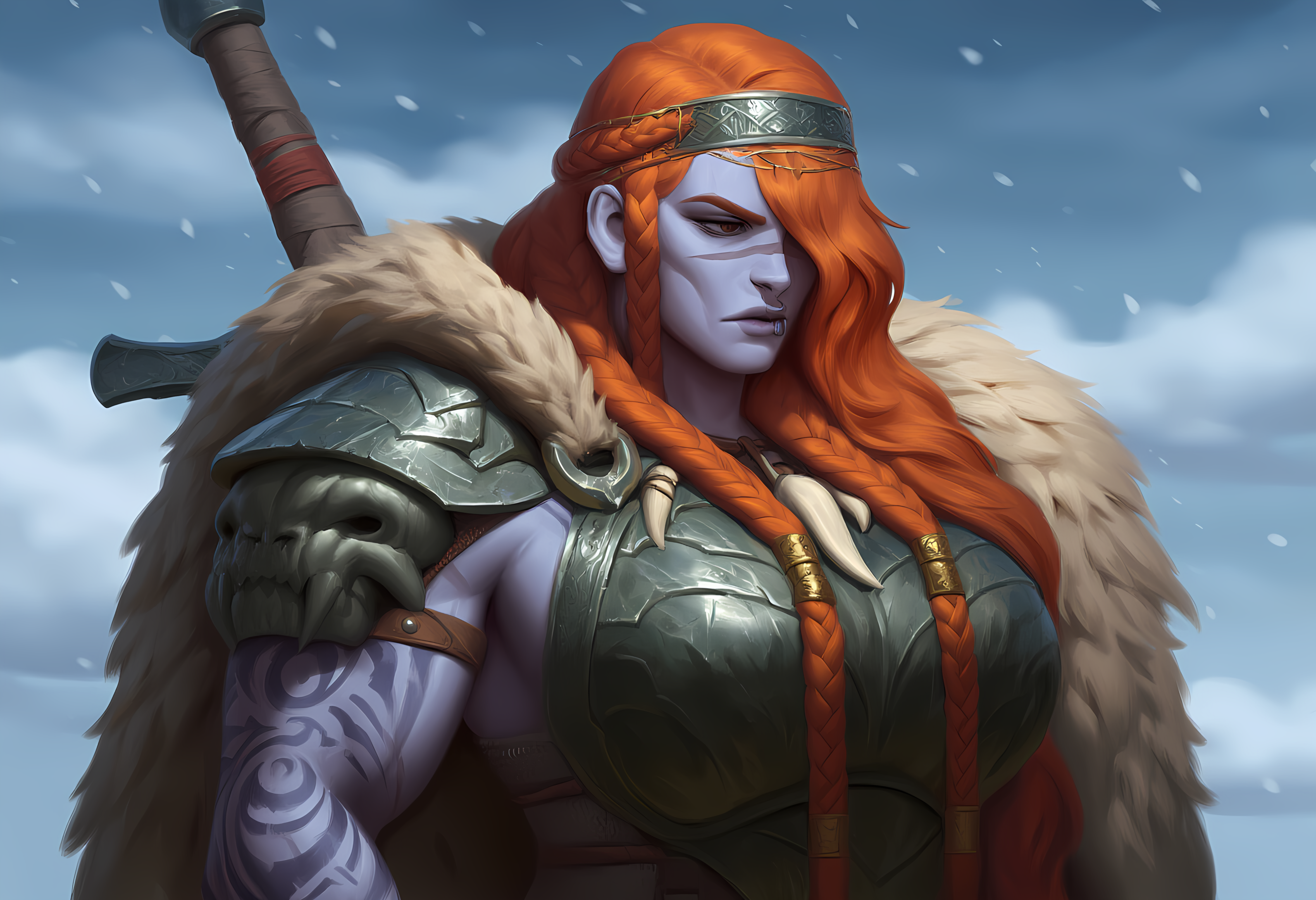 The tattoos that coat her icy-blue skin are her most identifying feature alongside her massive braid of beautiful orange hair - a sign of her status as Chieftain. This braid, adorned with new "totem-esque" rungs for each of her countless victories, nearly reaches all the way to the ground and is heavy enough to crush most smallfolk with the sheer mass of her hair alone.