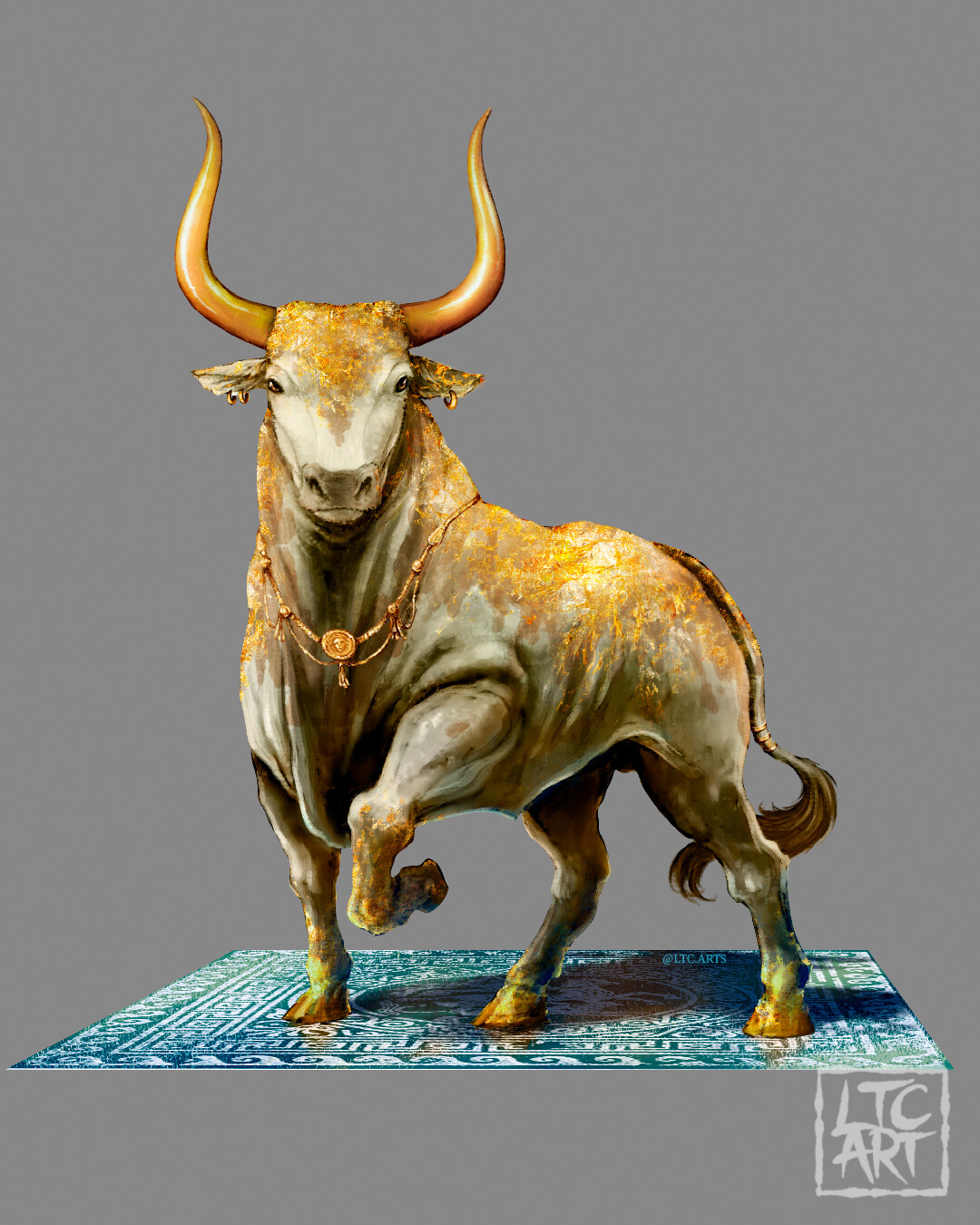 As a relatively small faith that only barely survived the recent apocalypses that claimed so many lives across the continent of Corexus, born from the dregs of merchant deities that predate The Godsfall that marked the current Era, the faith of Highmarket possesses only one artifact to speak of - a great and mighty statue of a charging bull made from solid gold that sits in the entry hall of the Bull Market Auction House, located in the city of Kazeb within the Golden Sultanate. This mighty statue, said to be a gift bestowed upon Highmarket's faithful in the years following The Godsfall, is said to be an ever-changing measure by which the conditions of markets across the world might be judged - so long as the statue stands whole and complete without blemish or fault, great wealth and prosperity can be assured to follow. To this end, the statue is said to possess the power to bring great fortune or misfortune to those who touch it - causing many to venture from across the continent in the hopes of laying hands upon the mighty Golden Bull and being blessed with riches and fortunes beyond their wildest dreams. To do so is difficult, however - as the faithful of Highmarket, who use the Great Golden Bull's ever-changing appearance to divine the health of financial markets and country economies across the continent and beyond, rarely allow outsiders to commune with the statue without first proving themselves worthy of doing so.