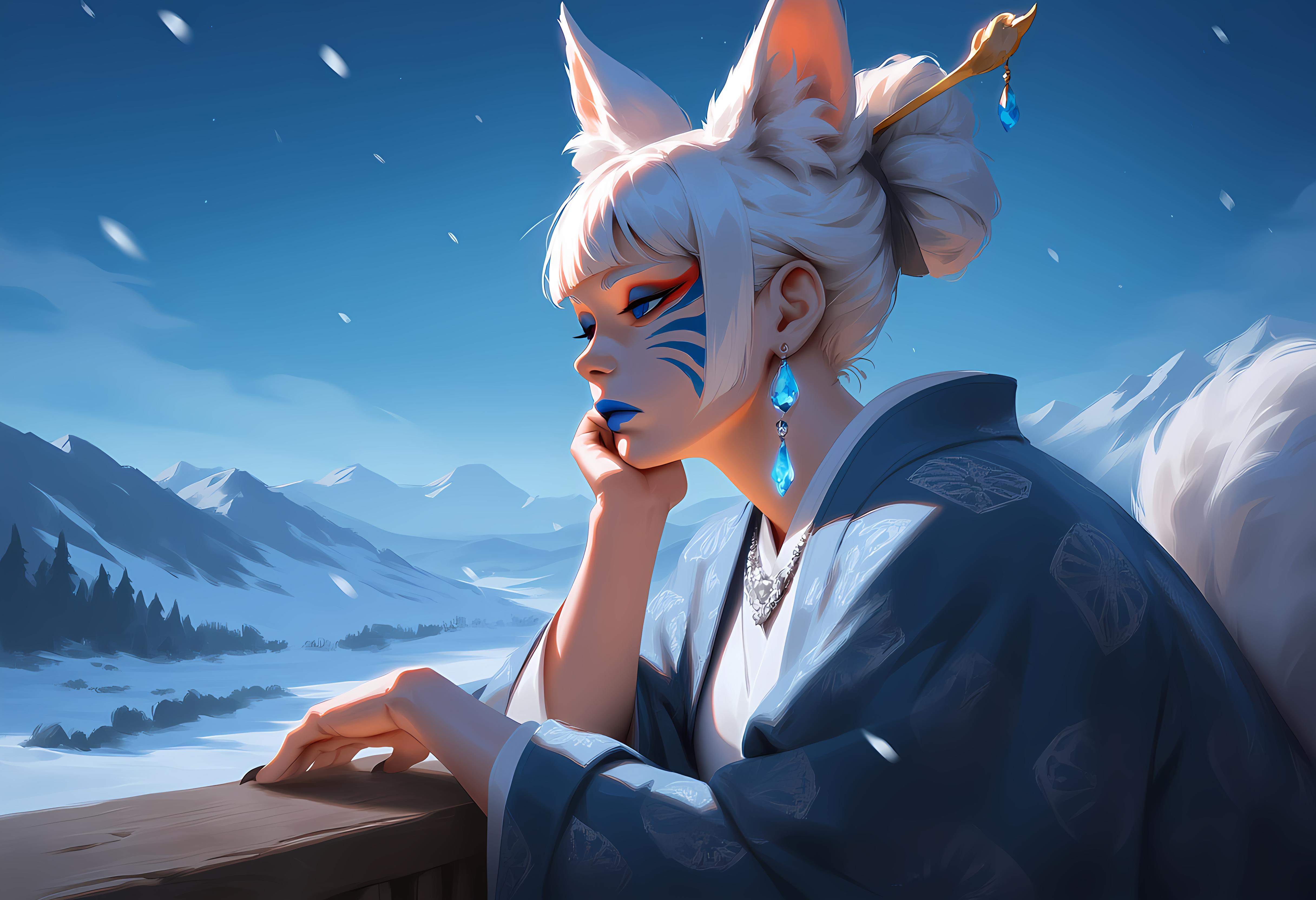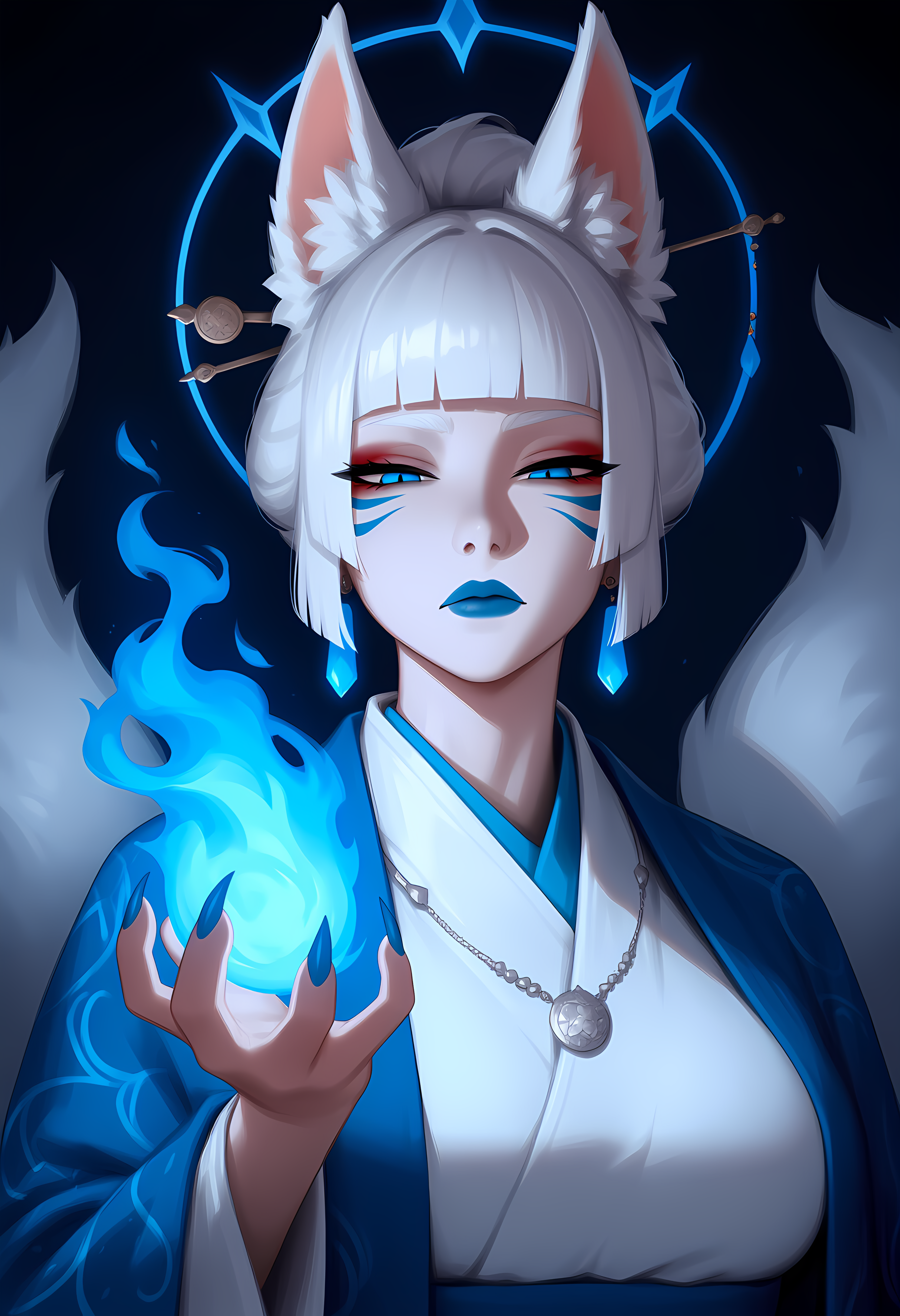She was often seen wearing a royal blue and white kimono when out in public, with little jewelry to speak of aside from some hair ornaments to keep her long white hair up in a loose bun when at excessively formal events. Her tails swished about freely, and she occasionally adorned them with ornaments and clasps to accentuate their beauty.