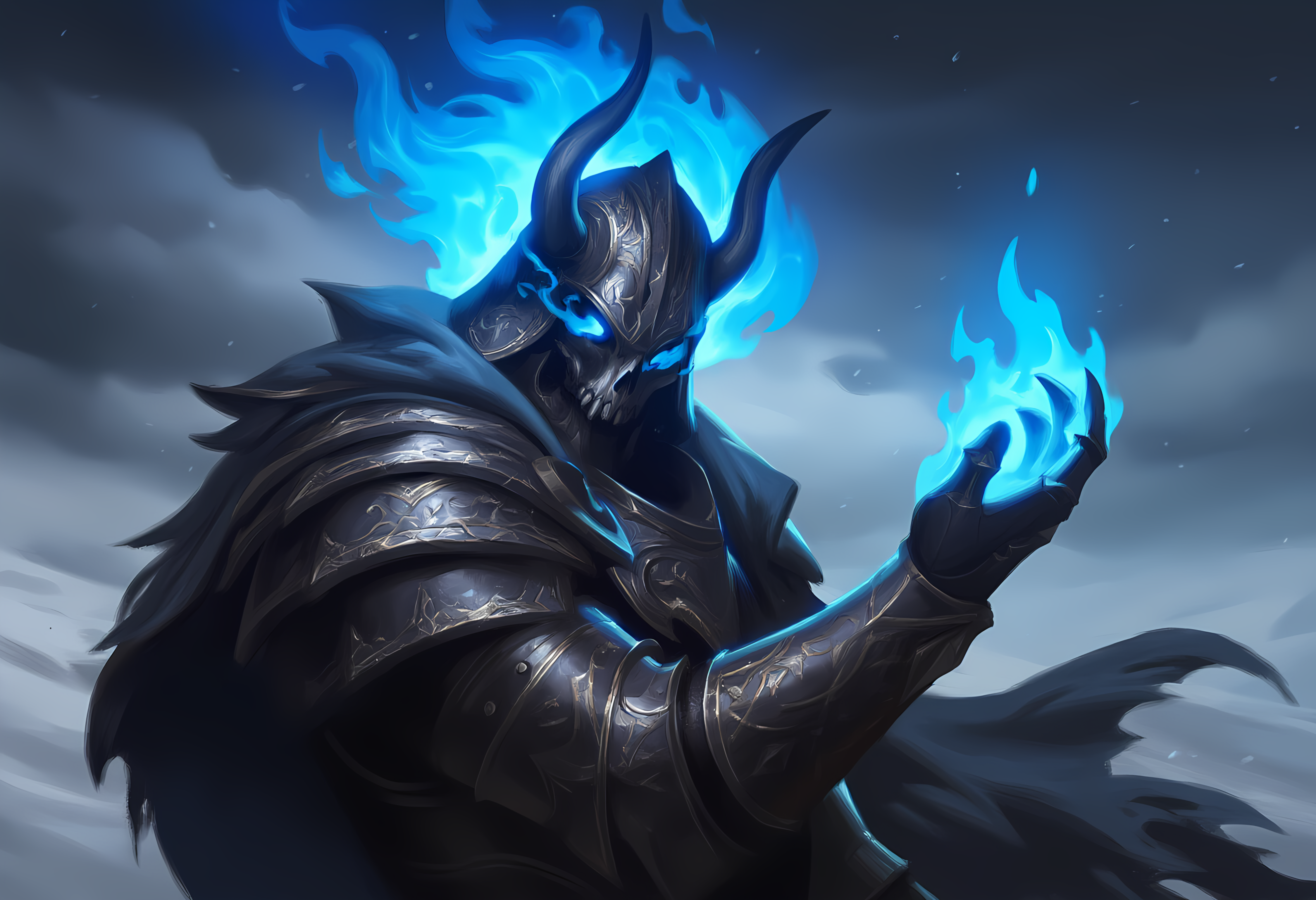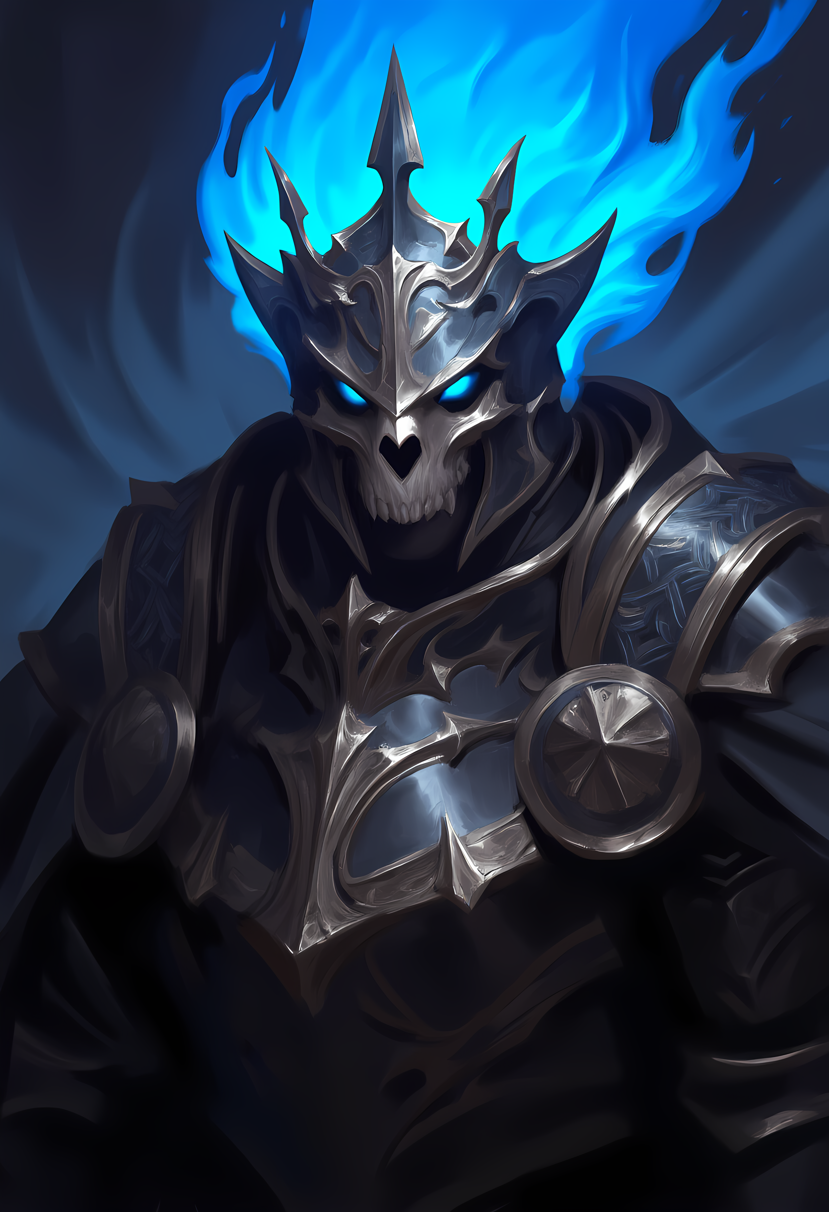 His helmet, as well, is a legendary sight - with a boneplate facemask on the front made from the skull of the greatest foe he ever faced, the helmet burns with an unholy freezing flame which grants him true sight at all times, such that he can see beyond all mortal and supernatural sight.