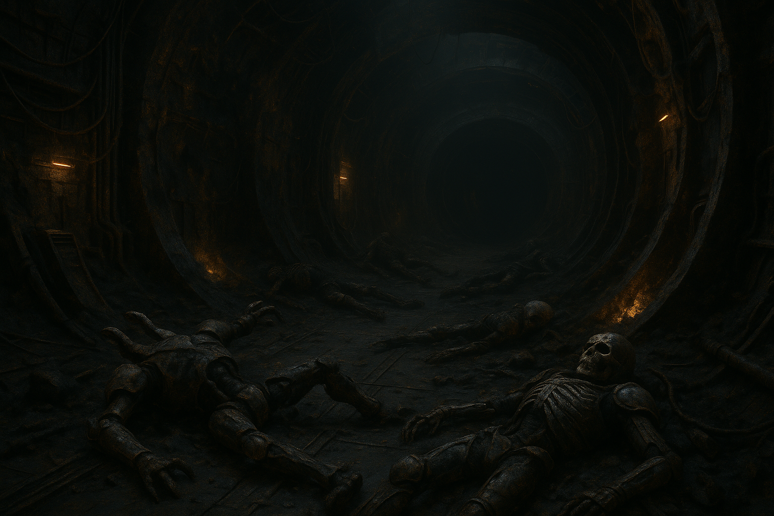 Was immer in den endlosen Korridoren des Nexusknoten der Leere vor langer Zeit einst geschehen sein mag, es war niemand mehr verfügbar um den Schrott und die unzähligen lange verwesten Leichnahme zu entfernen. Zerstörung und Tod ziehen sich durch die gesamte Anlage während man sich über verglühte Bereiche, zerschmettert und zerborstene Türanlagen und entlang von wuchtig eingeschlagene massiven Wänden arbeitet. Die Anlage selbst scheint in ihrer Grundfunktion unbeschädigt und es läßt sich nur hoffen, in den tiefen endlos scheinenden dunklen Gängen wartet nichts, was diese Schlacht überlebt hat...