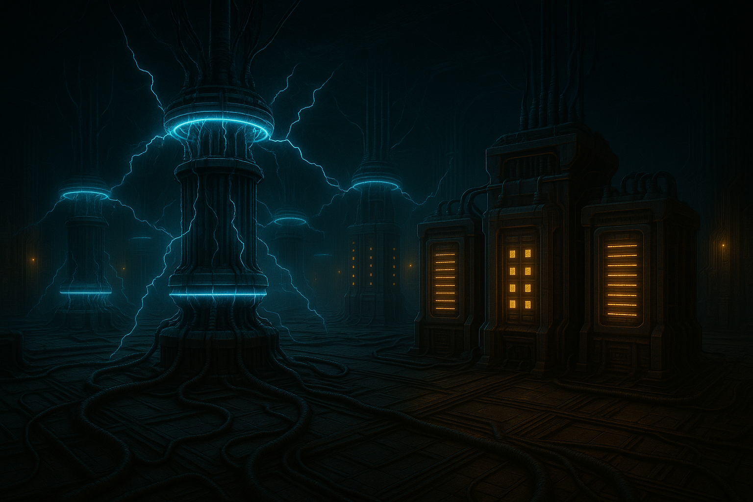 Tief in den Schichten des Nexusknotens befindet sich einer der letzten aktiven Hauptenergieverteiler – ein monumentaler Maschinenkomplex, der den Fluss der Energie aus dem Sonnenkern in die gewaltigen Portalfelder der inneren Sphären leitet. Diese Anlagen waren einst zahlreich und bildeten das pulsierende Herz der Megastruktur, doch nur einer, der während des großen Krieges nicht zerstört wurde, funktioniert noch.