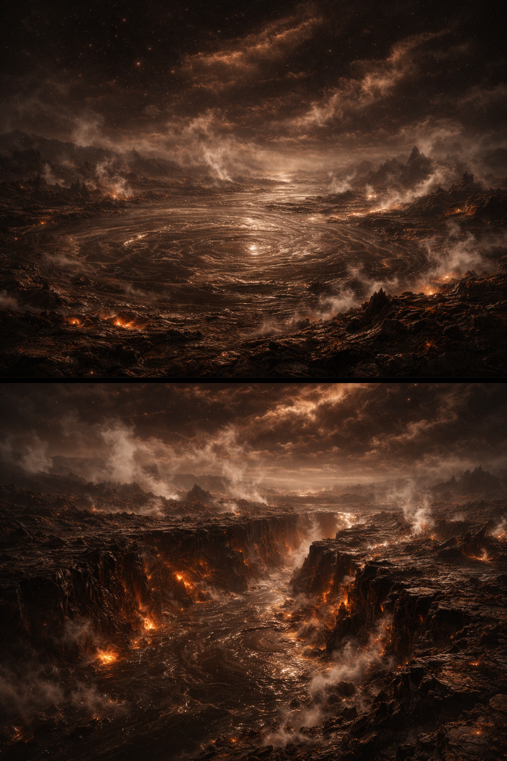 Ein besonders interessanter Ort ist ein mehrere Kilometer breites Becken aus langsam zirkulierendem Schlamm. Der Schlick bewegt sich in trägen Strömungen wie dickes Wasser. Sensoren zeigen schwache Energiesignaturen aus der Tiefe. Weit im Norden des Planeten liegt ein kilometerlanger Spalt im Boden, aus dem ständig warme, und metallisch riechende Dämpfe austreten.