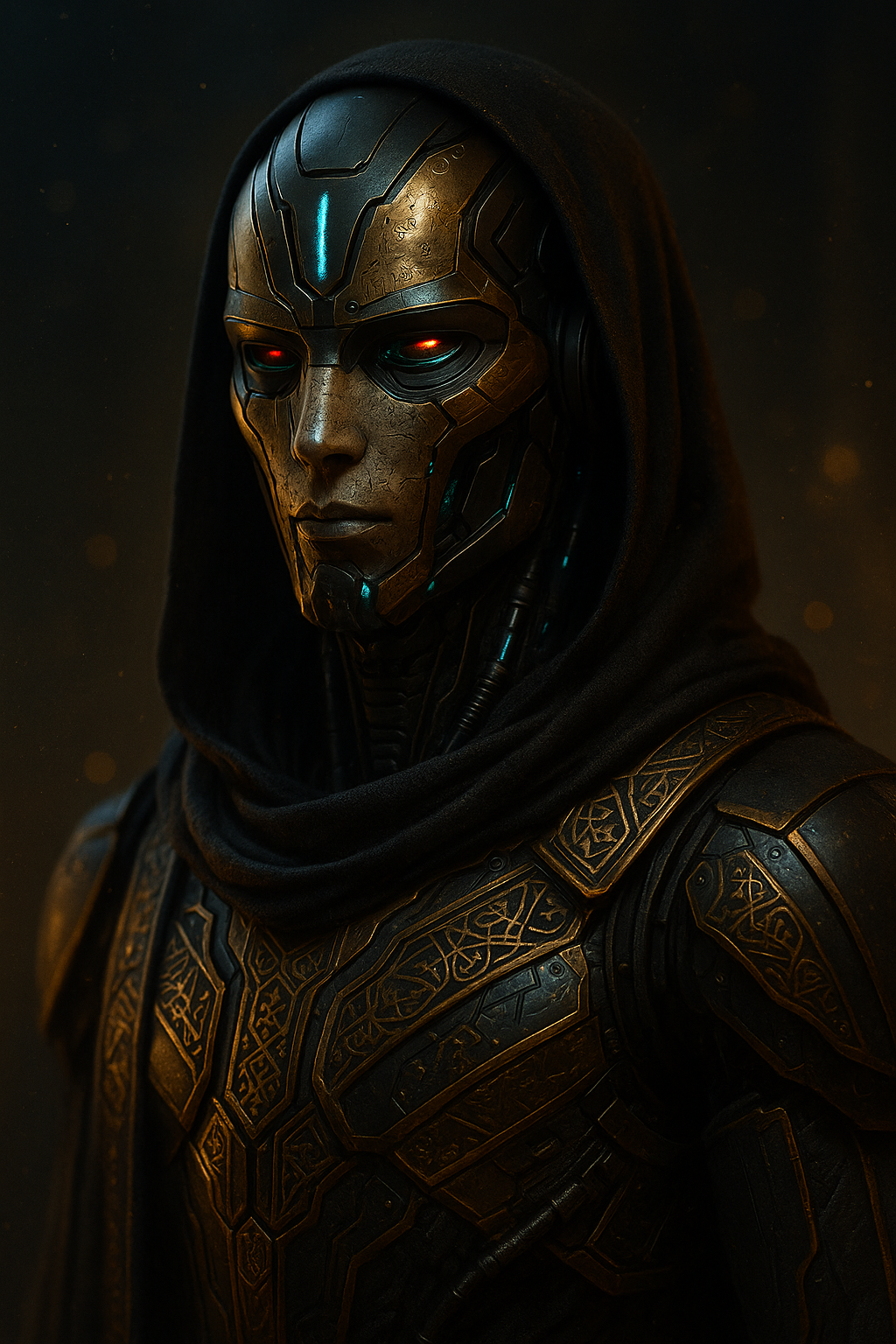 Sahir-3 trägt bevorzugt eine schlichte, dunkle Robe über einem Gehäuse aus gebürstetem Metall, durchzogen von feinen, geometrischen Gravuren - alte dabaranische Muster die von Wiedergeburt und dem Untergang sprechen. Seine Augen glimmen in tiefem Rot, gelegentlich durchbrochen von blauen Datenblitzen. Er wirkt auf den ersten Blick wie eine Statue, da er es gerne bevorzugt Bewegungen zu vermeiden, doch sein Bewegungsfluss ist präzise und geschmeidig. Während seiner Zeit bei Fizban legte er den Nachnamen IBN RAQUM an was Sohn der Zahl bedeutet. Für ihn ist dies eher Symbolisch um sich mehr der Kultur des Horizontes anzunähern obwohl diese ihn immer noch als künstliche Lebensform verachtet.