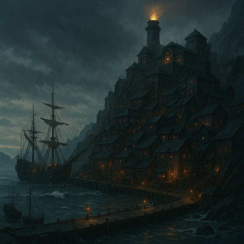 Built on a tiered cliff facing the open sea. The coastline is riddled with shoals, islets, and undercaves. The wind never stops, and seabirds rarely settle — some say they avoid the port out of respect.
