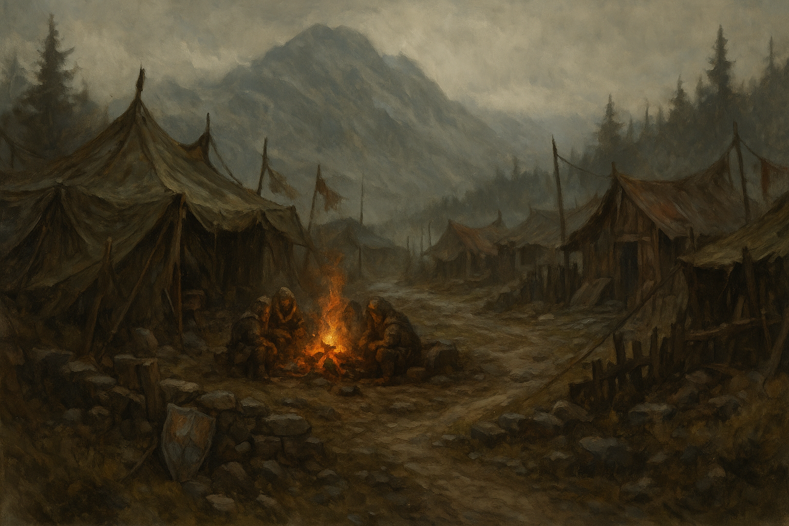 Tucked between a shale hill and the gnarled roots of the southern ridge trail, The Foot’s Grime Encampment squats in the shadow of Highmount — both literally and ideologically. Just a half day’s walk from the capital’s silver-forged towers, this haphazard sprawl of mud-streaked tents and rusted braziers is home to ex-soldiers, disgraced officials, broken oath-takers, and working-class castoffs who once bled for the Ridge and were offered nothing in return.