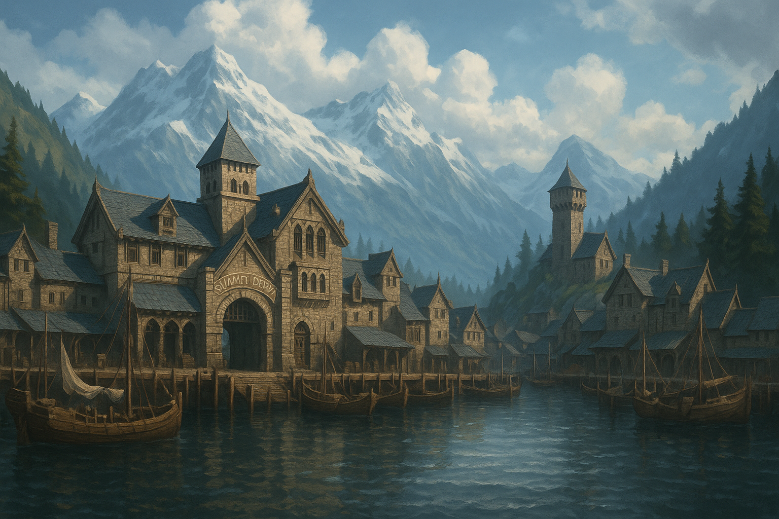 Nestled between the cragged teeth of the Azure Ridge’s northern cliffs and the cold sea beyond, The Summit Delta stands like a scarred sentinel staring across the strait. From its heavy granite docks to the soul-lit watchtowers, the Delta is no place for the soft of heart. It is a settlement born of necessity, carved from frost and stubbornness, forever caught between the cold order of the Ridge and the wild chaos of The Summit Lagoon to the north. When the clouds part during Midsummar and the peaks reveal their white crowns, a hush falls over the Delta, and even the rowdiest taverns give pause to the holy stillness. But most of the time, it is a place of departure — for pilgrims seeking visions, for adventurers courting madness, and for dwarves trying to outrun the weight of tradition.