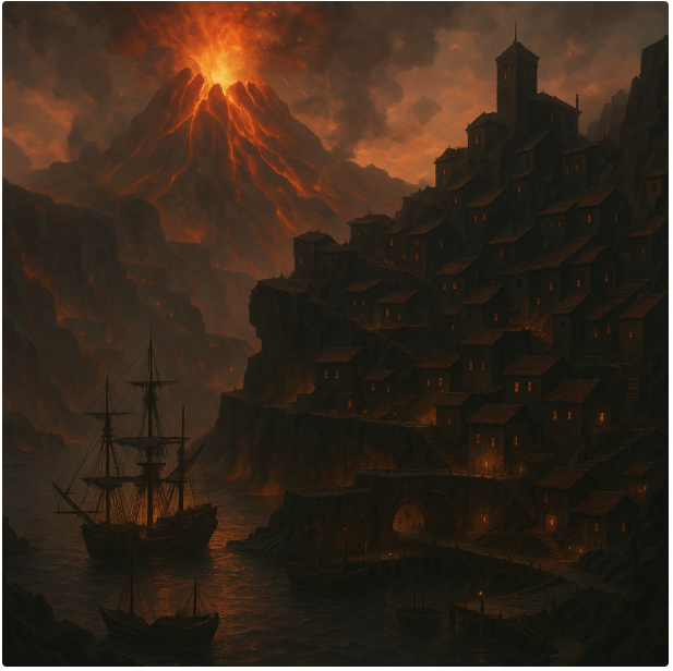 The Vermillion Harbour is the sole organized settlement on The Ruby Mount — a jagged coastal refuge nestled in a half-sunken caldera bay formed from a previous volcanic collapse. Perched on scorched cliffs and partly built into hardened lava tubes, the Harbour serves as the gateway to the molten heart of the island. It is a rough-and-tumble town of salvagers, miners, outlaws, and exiles, governed not by laws but by control, trade, and reputation. Resources are scarce, and survival is a daily negotiation.