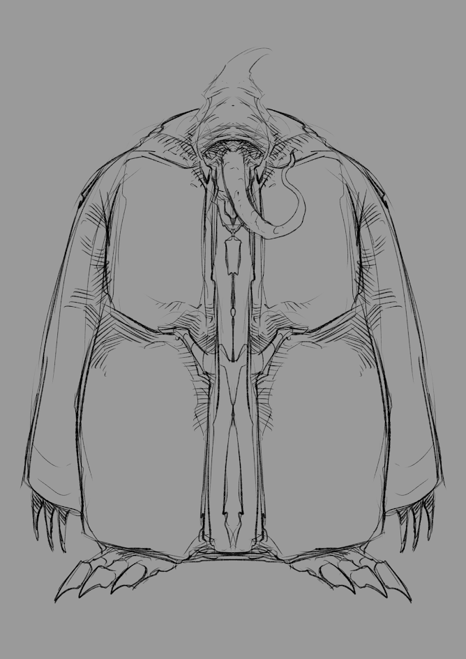 Just as their smaller counterpart prefers to hide its form beneath an ominous cloak, the zealot minister hides most of its features using the same article of clothing. The robes it had once worn as a lesser demon have grown with it due to the ritual, ensuring its cloak continues to fit around its fattened form. Underneath its robes, these demons have flabby pale skin and thick three-fingered hands adorned with long claws. The zealot minister possesses a head somewhere between a naked mole rat and a lamprey with a prominent mouth. Thin dry patches of fur adorn the demons otherwise bare flesh of the demon among splotchy rashes and swollen blisters. The most unusual feature boasted by this species is the enormous serpentine tongue which can always be seen hanging from their open maws. These monstrous tongues stick out far enough to poke out from the hood of their robes and act like a slimy trunk of the demon.