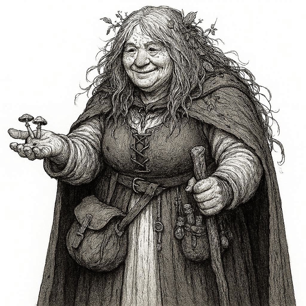 Description: Lulu Fernfoot is an elderly halfling matron of diminutive stature, her silver-ringed hair gathered in a loose bun. She leans heavily on an ornate walking stick carved with entwined vines, her gait marked by a pronounced limp. Behind her wise green eyes lies decades of herbal study, and the gentle jingle of glass vials follows her through the snug shelves of her Whiterest apothecary. She greets every customer as if they were her own grandchild, dispensing potions, poultices, and sly grandmotherly advice in equal measure.