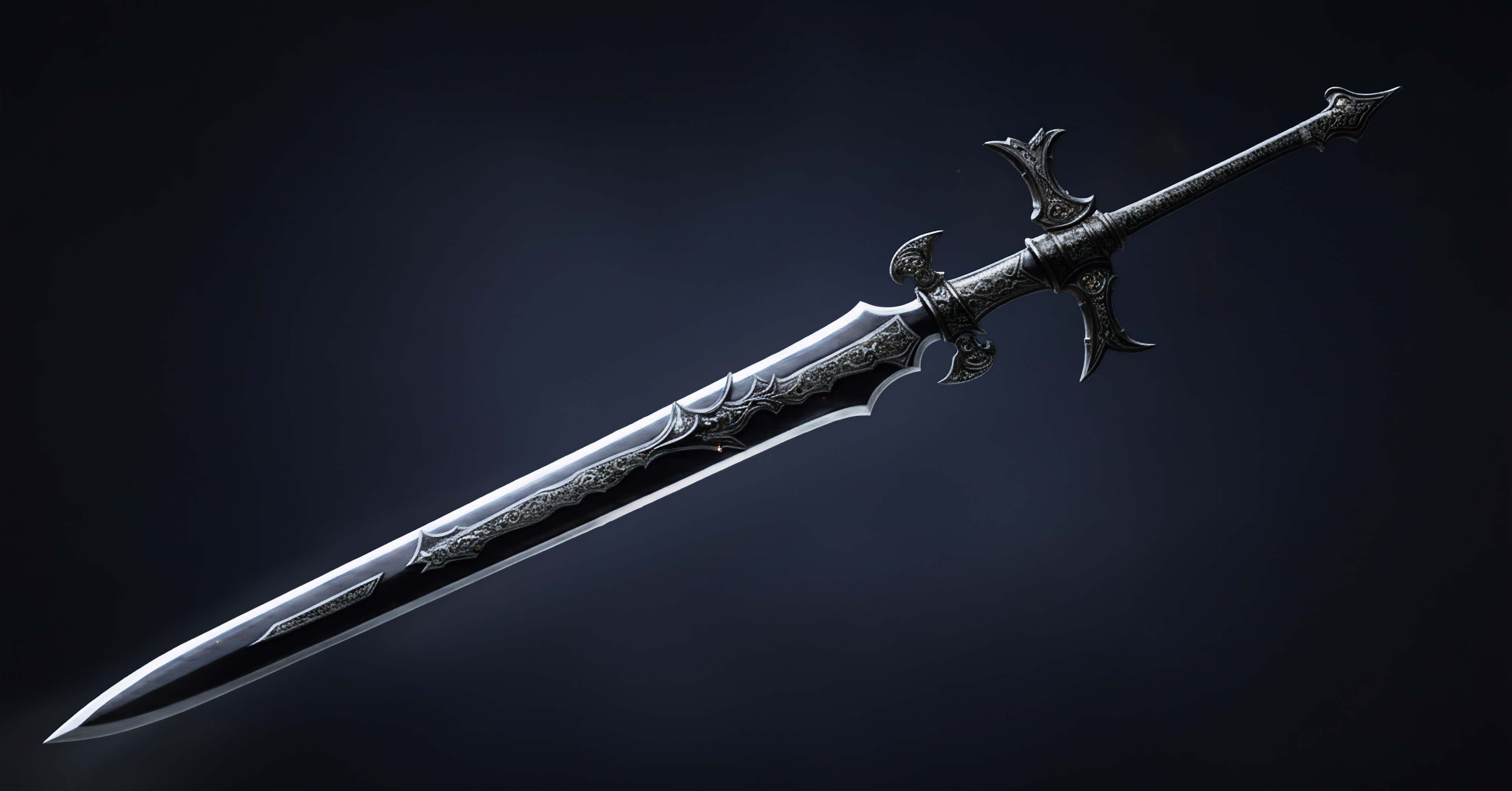 Forged from 6 feet or so of black steel, Azonmut is a visually impactful weapon. Because it was created by Samael, who has power over metals, the sword is a single, uninterrupted piece of metal, rather than being pieced together by disparate parts. It is also engraved with complicated filigree textures that match those typically displayed on the clothes and architecture of the House of Asther.