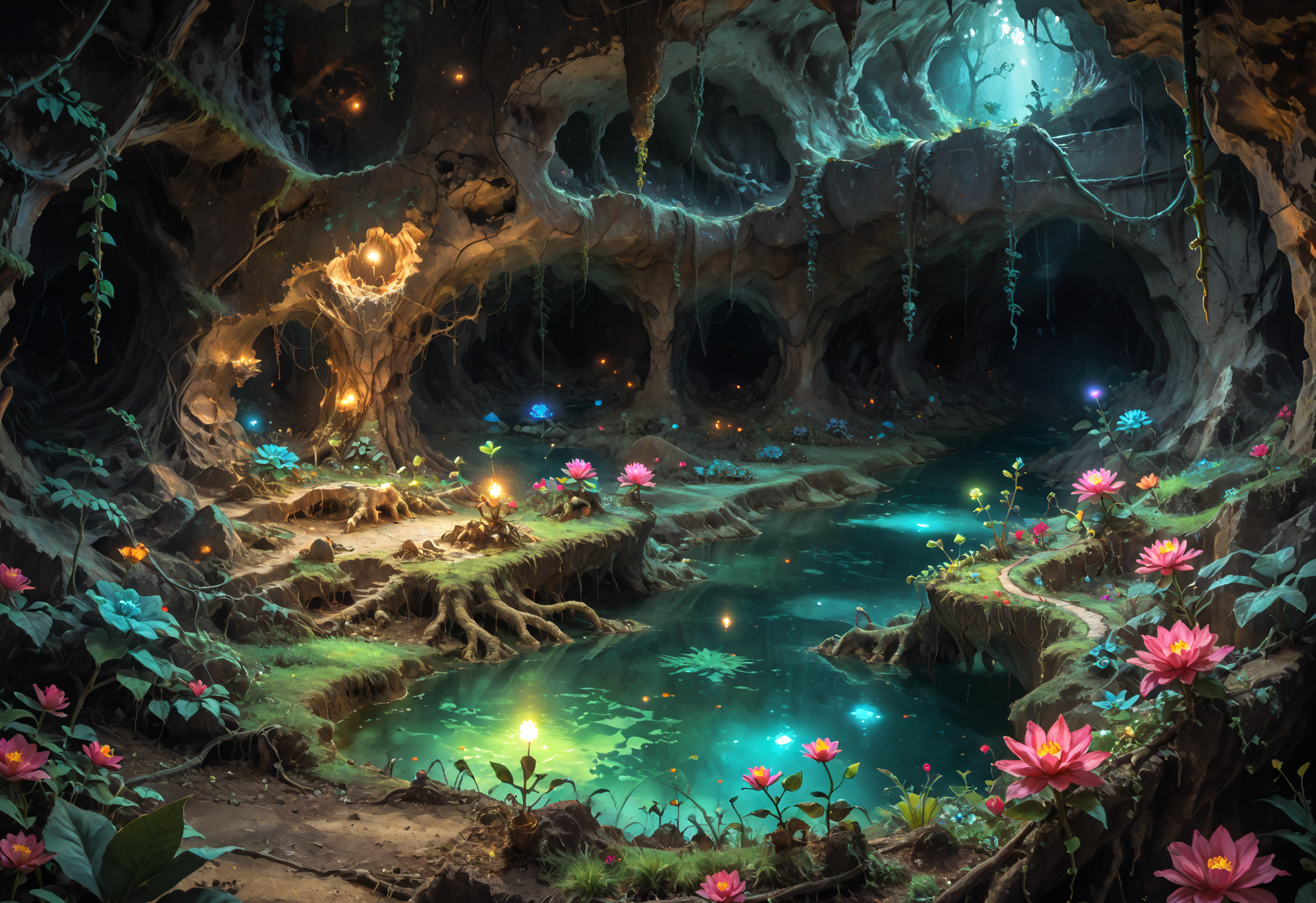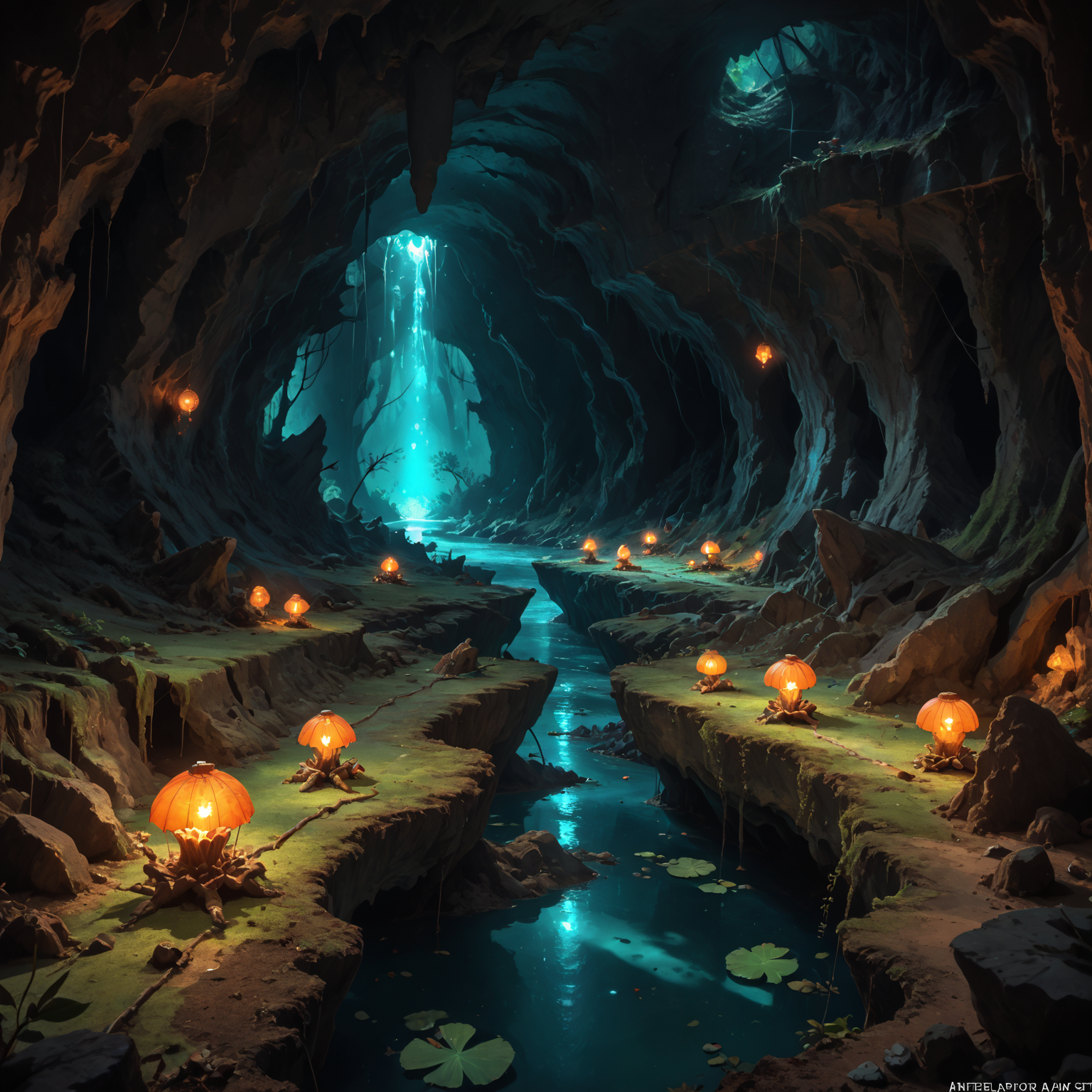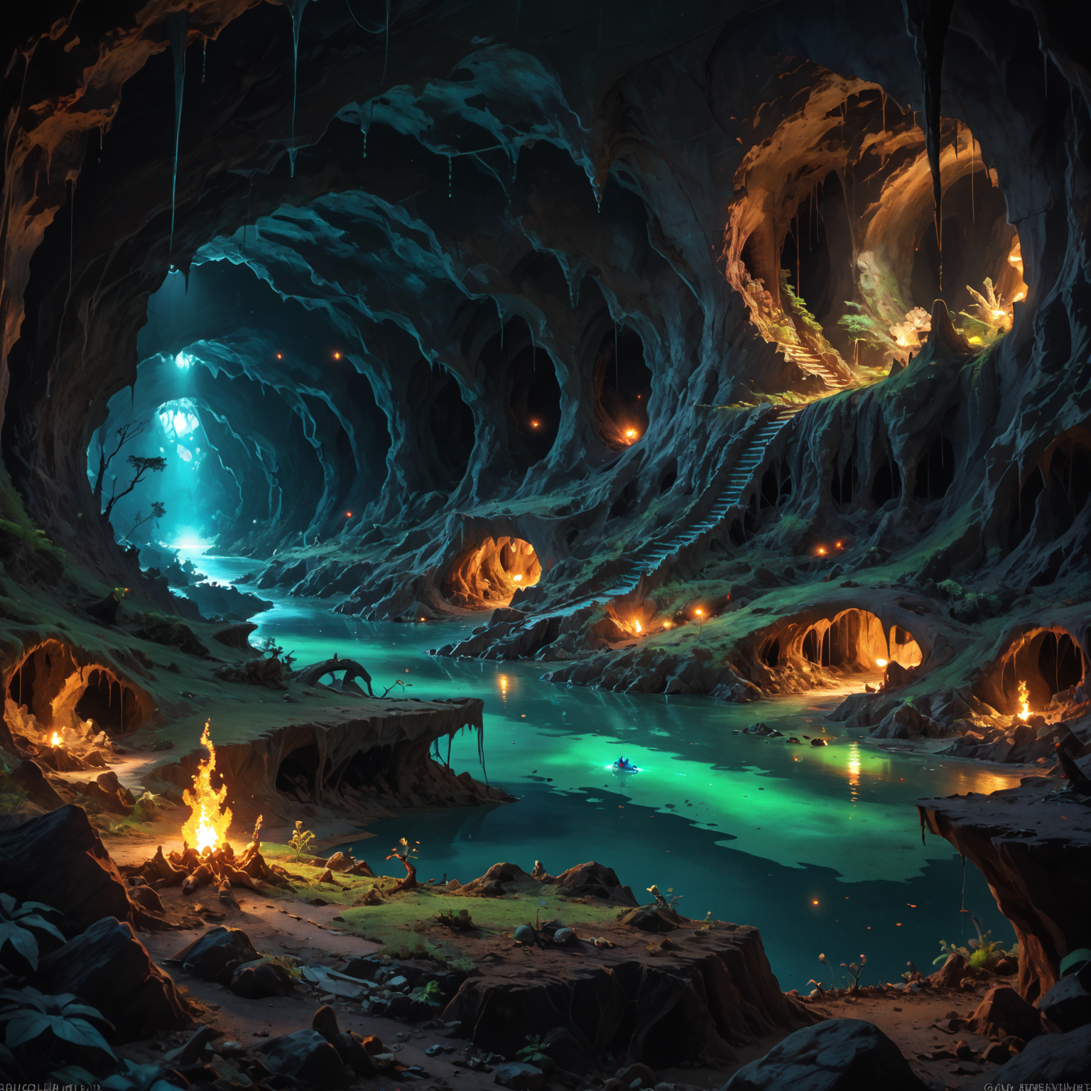 Bioluminescent fungi scattered throughout the caverns provide various levels of light... as do the gently glowing bioluminescent waters.