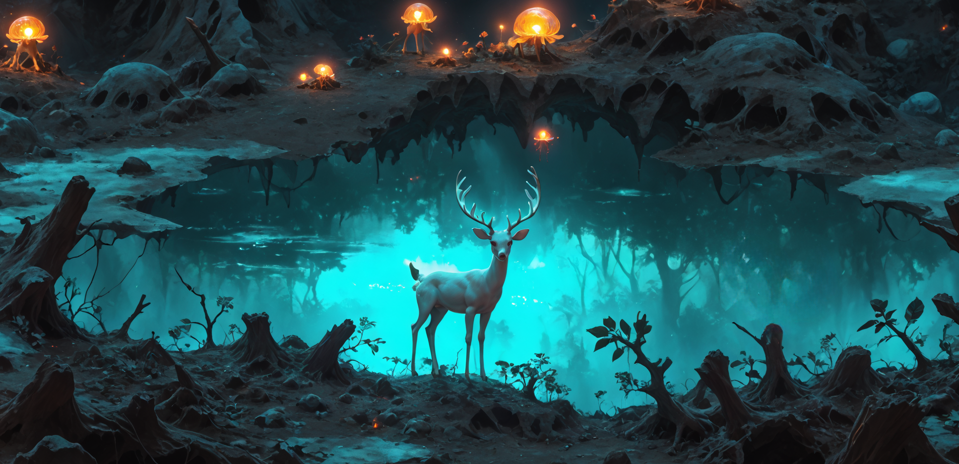 Frolicking in their glow, a number of small furry animals make their homes in the trees, or around the forest areas. Fluffy white bats with blue ears reside in the canopy, feeding on the insects and cave beetles. Luminescent moths shine like fireflies in the shadows of the caverns.