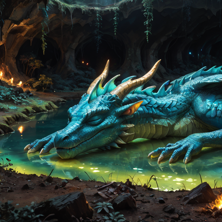 A patch of underground foliage is visible in the cavern on the upper right. ...the sneaky head of a bathing dragon can also be seen in the water!