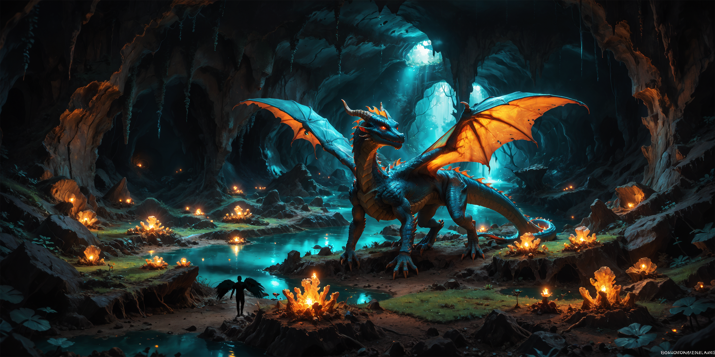 A dragon can be seen toward the back of the cave, resting on the stone floor.