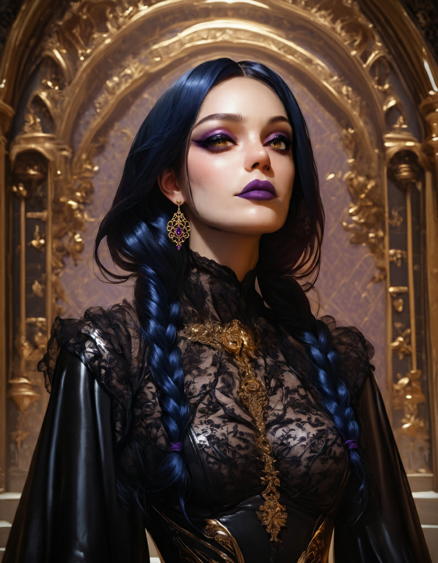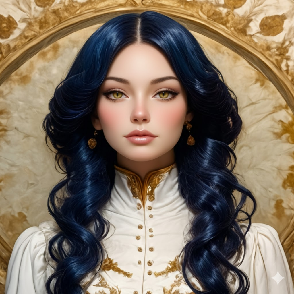 Her hair is actually blue, but dark enough to be casually mistaken for black. She nearly always keeps it in low twin braids. The length can vary somewhat over time - at its longest it reaches past her hips. At its shortest, it ends at around mid-chest.