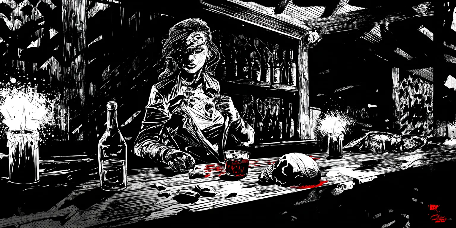 Karn exhaled like he’d been holding his breath for hours. Nella let out a disbelieving laugh. Rook’s eyes flicked from Vex’s bleeding stomach to Rowan’s empty stare, and for the first time all night, he looked genuinely impressed. Vex slid off the stool. She limped toward the exit, with her boots leaving wet prints on the boards. A half empty bottle of booze hung from her hand. Behind her, Rowan’s head tilted toward the guttering candles, as if it begged the flames not to forget him. At the doorway, she paused.