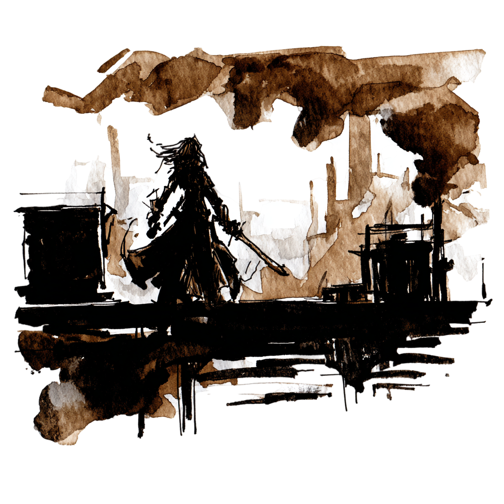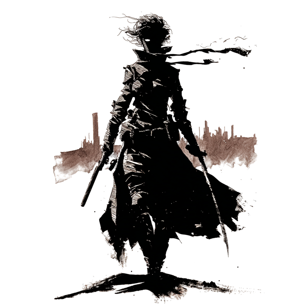 Vex walked in front, as always. Her boots ground broken glass and old bone into powder. The air tasted of rust and ash and the tired chemical sting of places the Veil had scraped too thin. She walked as if the fractured city belonged to her, or owed her, or both. Her long coat whipped at her boots. Weapons clinked softly at her hips, shoulders, lower back. The left half of her face gleamed with scar tissue in the weak light, melted into a permanent red grin that exposed too much tooth. The right half did its own work: hard eye, raised brow, the suggestion she was unimpressed with everything.