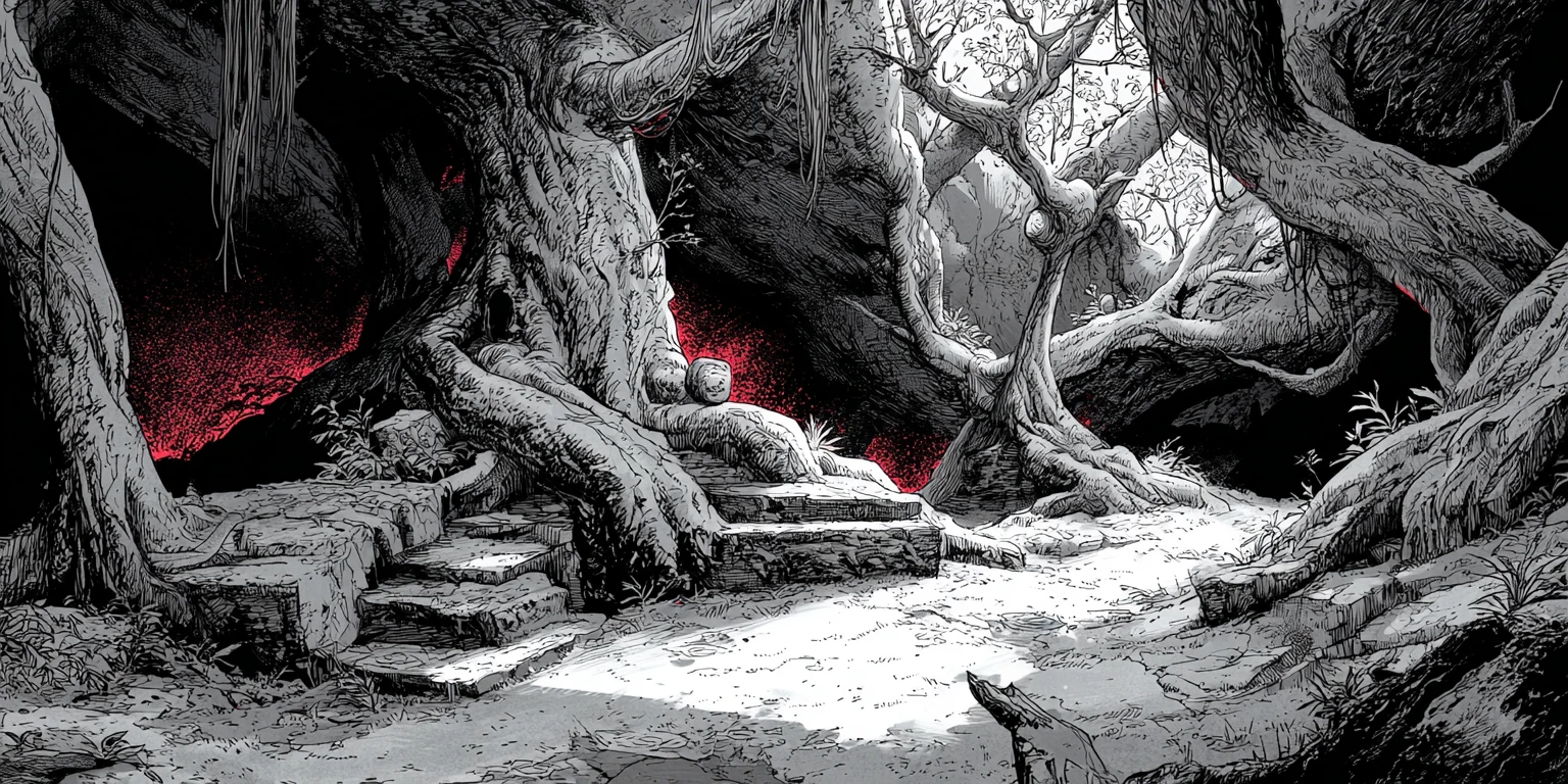 The descent is short - no more than ten meters - yet it feels deeper, as though distance bends. Time stretches softly here. At the bottom, the chamber opens into the old grove, what remains of it at least, preserved in shadow. Thin threads of light seep through the fractured stone above. Moss carpets the floor. Ancient trunks, long petrified, spiral in silence.