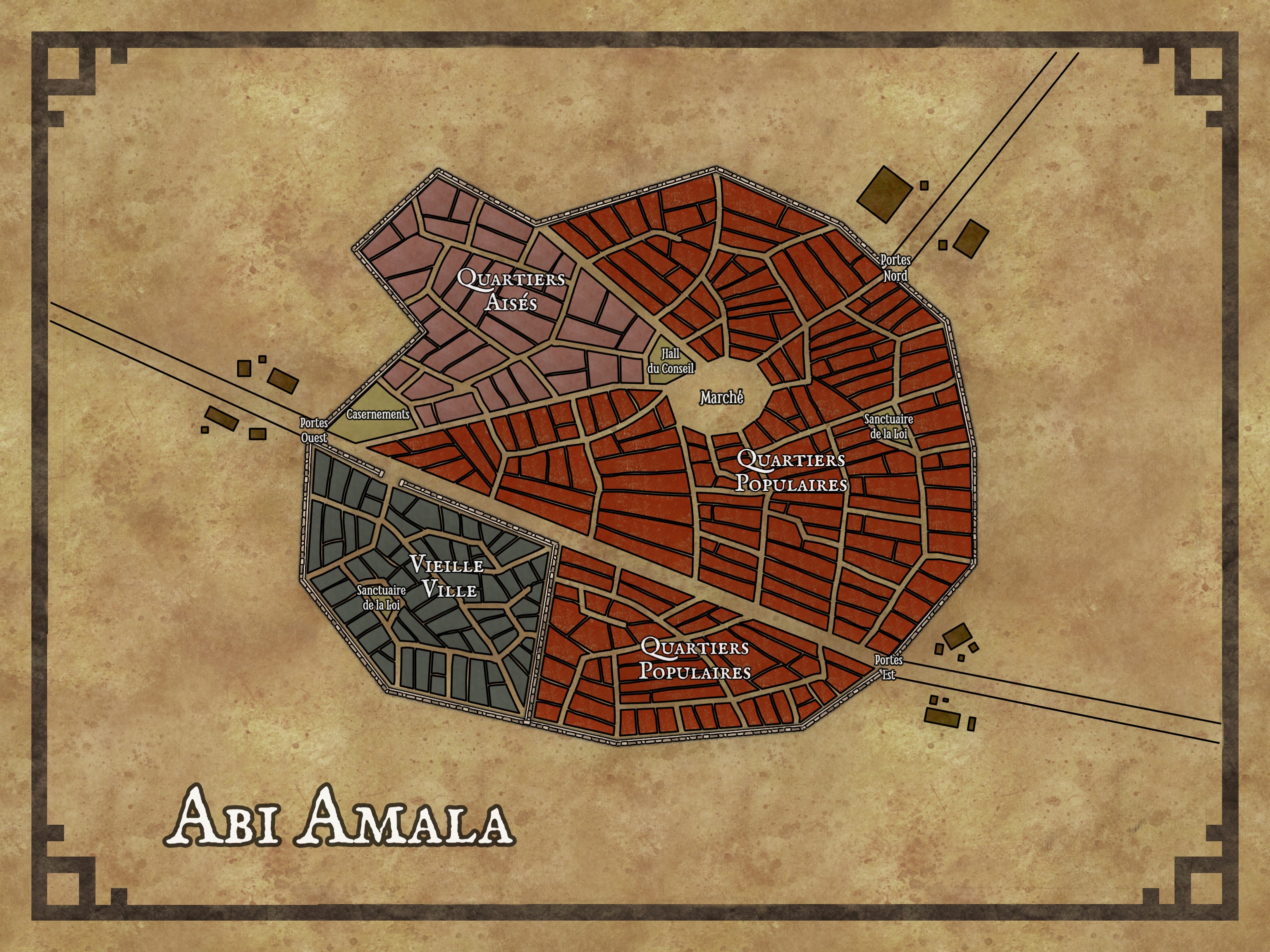 Abi Amala est une vieille cité-état du Temel Diourm, traversée par de nombreux marchands. Mais malgré les richesses qui y transitent, c’est un lieu relativement morne. Pire, la cité a attiré un nombre important de criminels qui la gangrènent de l’intérieur, au point que certaines caravanes évitent les lieux.