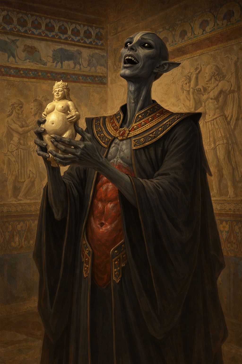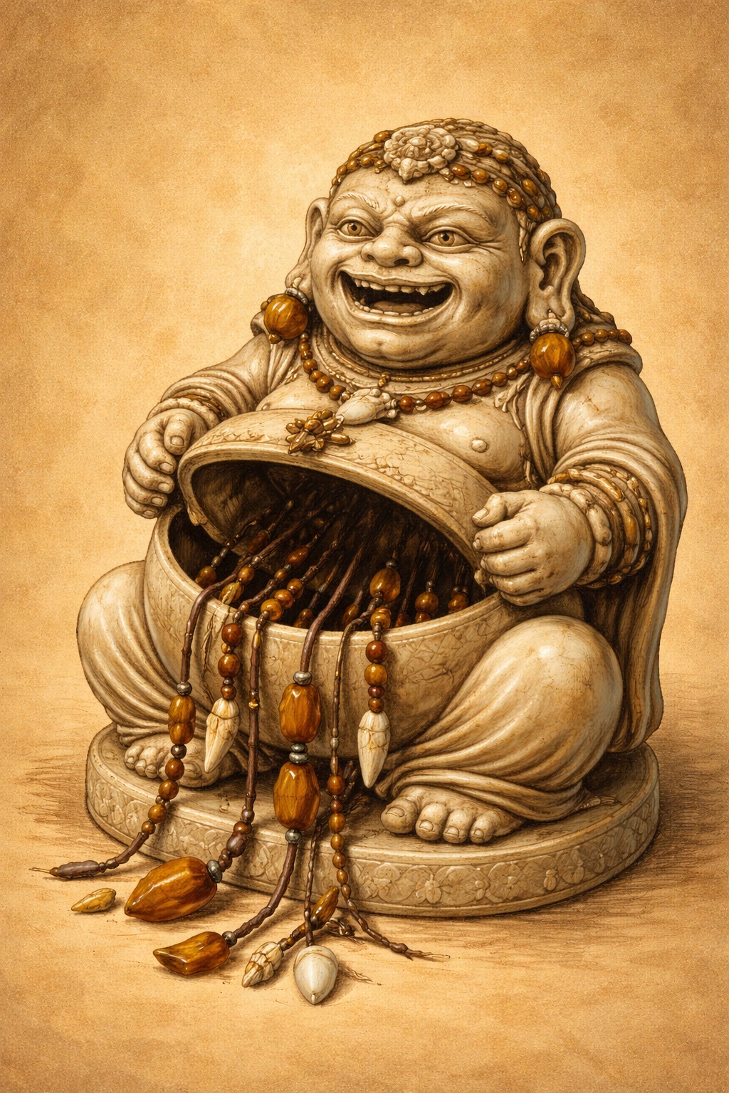 Loi et des ancêtres. Les aruspices du continent utilisent généralement des statuettes d’ivoire spéciales représentant des ancêtres illustres. Leur cavité stomacale, surdimensionnée et creuse, est pourvue d’un clapet, permettant ainsi aux aruspices d’y placer des charmes et des colifichets. Ceux-ci prennent généralement la forme de fils de cuir sur lesquels sont passés des perles, des pierres taillées, des petits os, voire des pièces de monnaie.