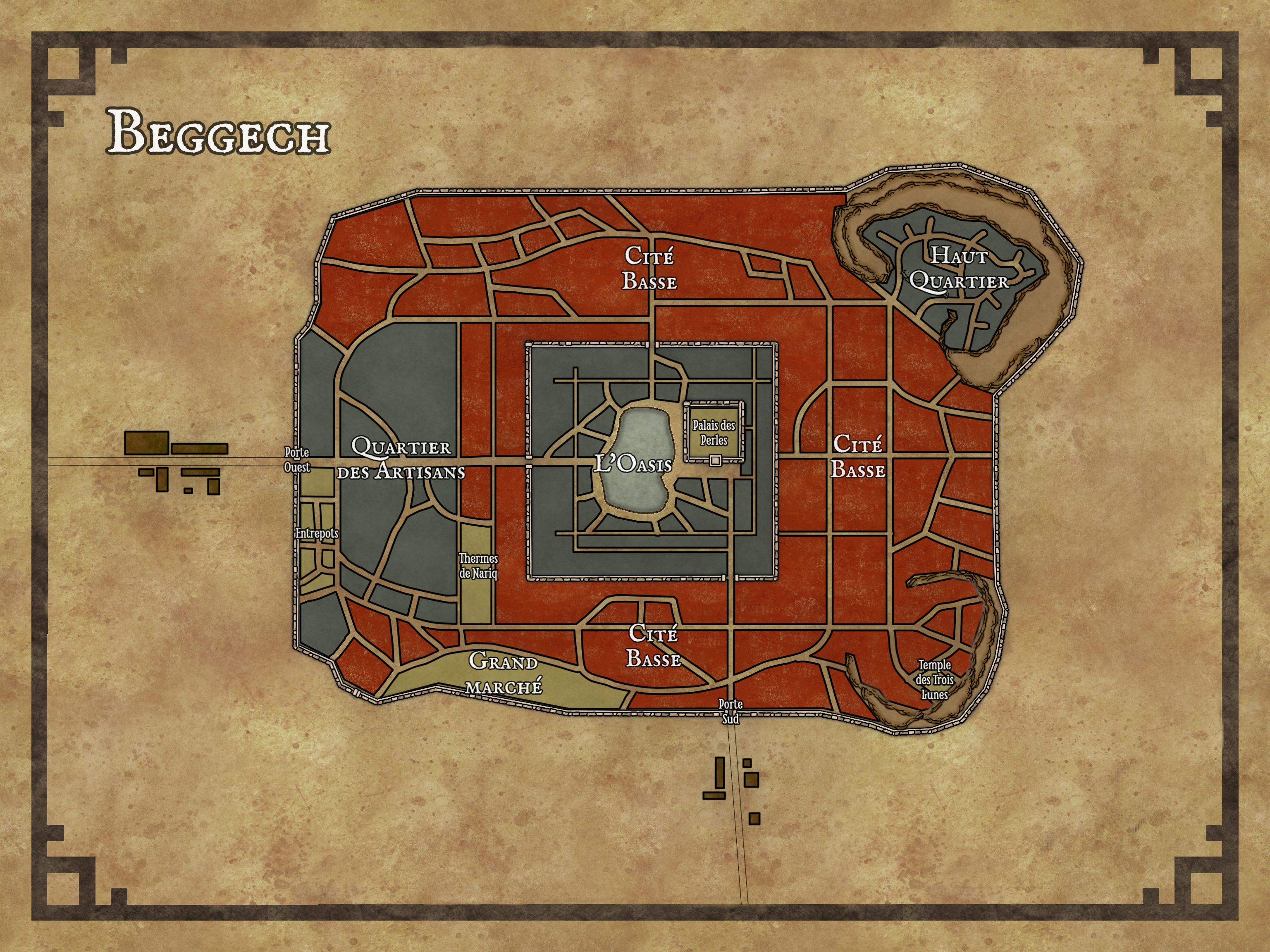 Beggech s’étend autour d’une grande oasis et de deux collines rocheuses. Le centre de la cité est construit sur le modèle des villes de l’Empire de Curodia, avec de grandes avenues en quadrillage et une large place centrale, mais à tendance à perdre en cohésion en périphérie. En plus de l’oasis, Beggech est reliée au système des qanats souterrains qui alimentent le pays en eau. Reposant dans de profonds bassins souterrains, celle-ci est fraiche à l’année.Le Haut-Quartier