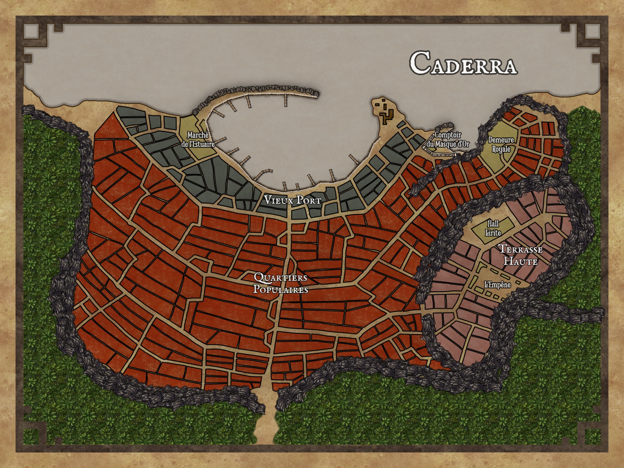 Caderra ne dispose d’aucune enceinte et n’a pas de marine de guerre. Pour sa défense, elle se repose sur quelques navires de patrouille légers, au mieux armés de balistes légères (et souvent commandés par d’anciens capitaines marchands).Rumeurs et intrigues