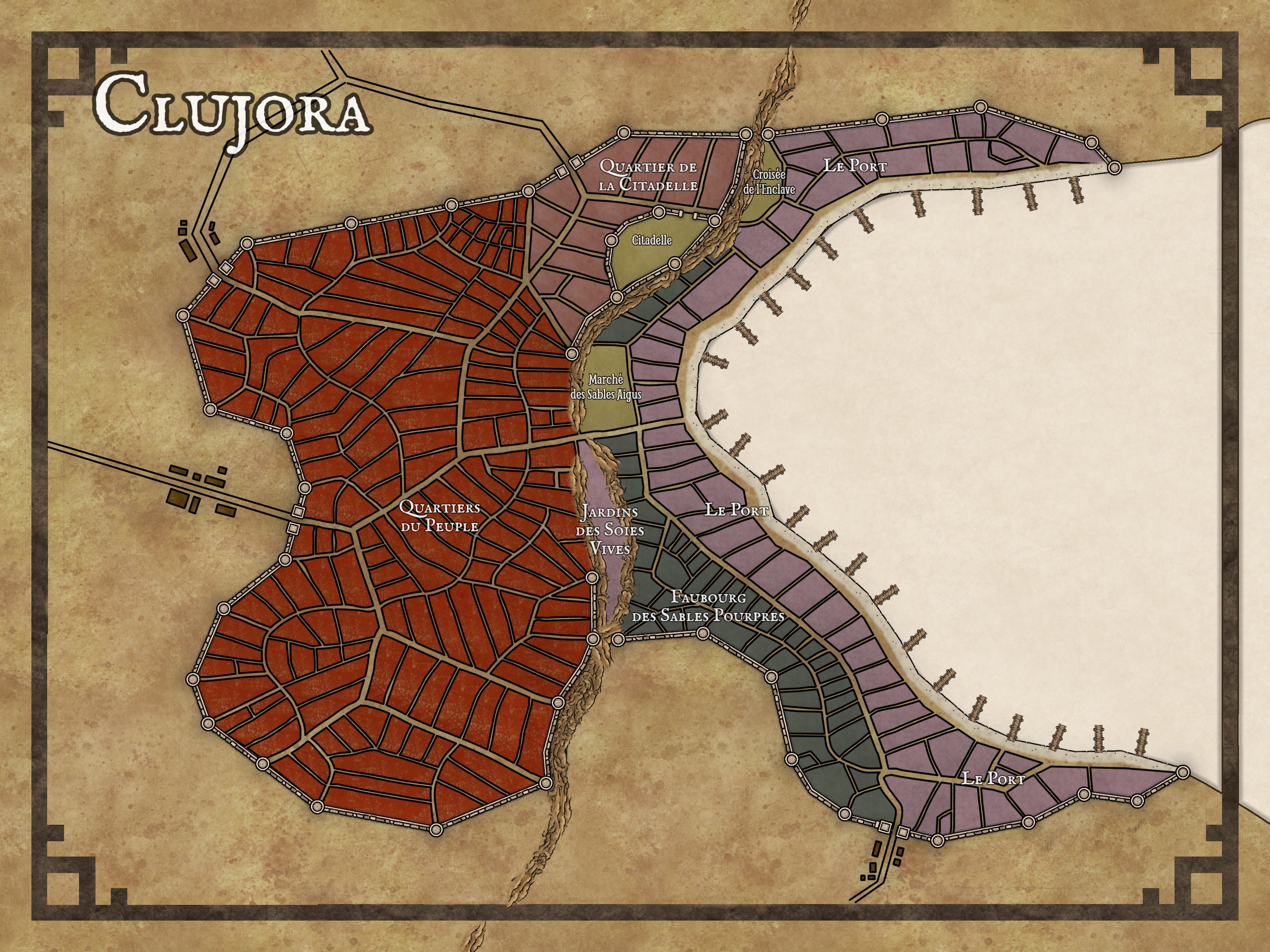 S’étalant sur toute la largeur de la baie, le port est ancien, ses quais de briques souvent en réparation et ses pontons surchargés. On y trouve des entrepôts étroitement surveillés, des logements modestes, des tavernes enfumées et des bordels ouverts à tous les marins de la Mer Manéenne.- Croisée de l’Enclave. Secteur discret abritant les entrepôts de la Main d’os, l’organisation esclavagiste tolérée par les Prestigieux (cf. plus bas). L’accès est restreint et des vigies en haut des terrasses surveillent l’aller-venu des étrangers.
