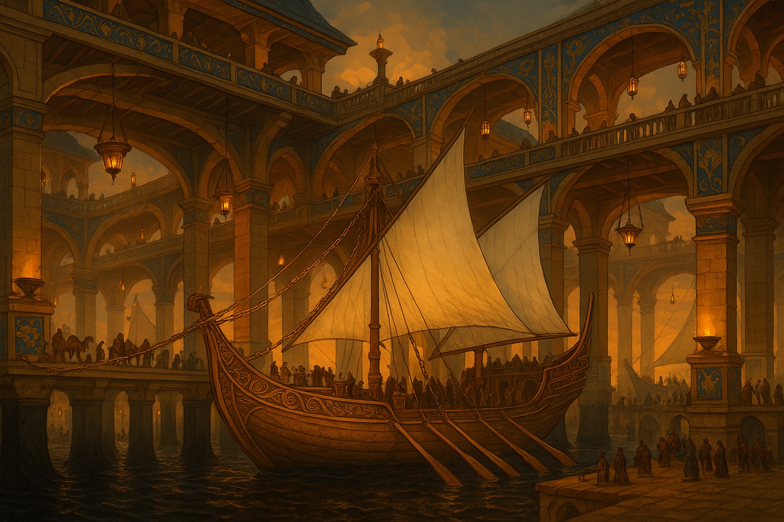 Vus du large, les Docks Suspendus ressemblent à une forêt de piliers et de plateformes dressées au-dessus d’une mer sombre et huileuse. Merveille d’ingénierie, chaque quai est soutenu par de gigantesques piliers de grès noir fichés profondément dans les sables marins de la baie et dans la roche de la caldeira. Entre eux, des arcs de bois courbé forment des ponts suspendus, reliés à des plateformes de chargement.