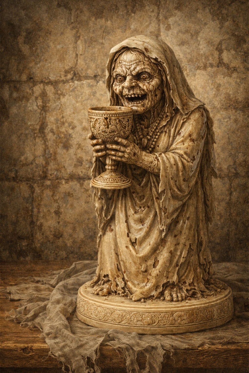 Les druides gris ont une affection particulière pour les nécrophages, des créatures torturées ayant pour ainsi dire déjà un pied dans la tombe. Certains puissants adeptes maitrisent la sorcellerie et les sombres rituels permettant d'en créer de nouveaux. Étonnamment, la majorité des druides gris n’éprouve pas un intérêt particulier pour les morts-vivants. Beaucoup jugent qu'il ne s'agit que de simples poupées asservies et sans intérêt, qu’ils laissent volontiers aux druides verts avides de domination. Il existe bien sûr des originaux qui voient au contraire dans la "non-vie" une sorte de malédiction directe d'Az'mitar, l'interdiction suprême de goûter au repos de la tombe après une délicieuse agonie. Preuves tangibles de la toute-puissance de la Mère des Cendres, les morts-vivants doivent être craints, vénérés et méprisés tout à la fois.Symbole