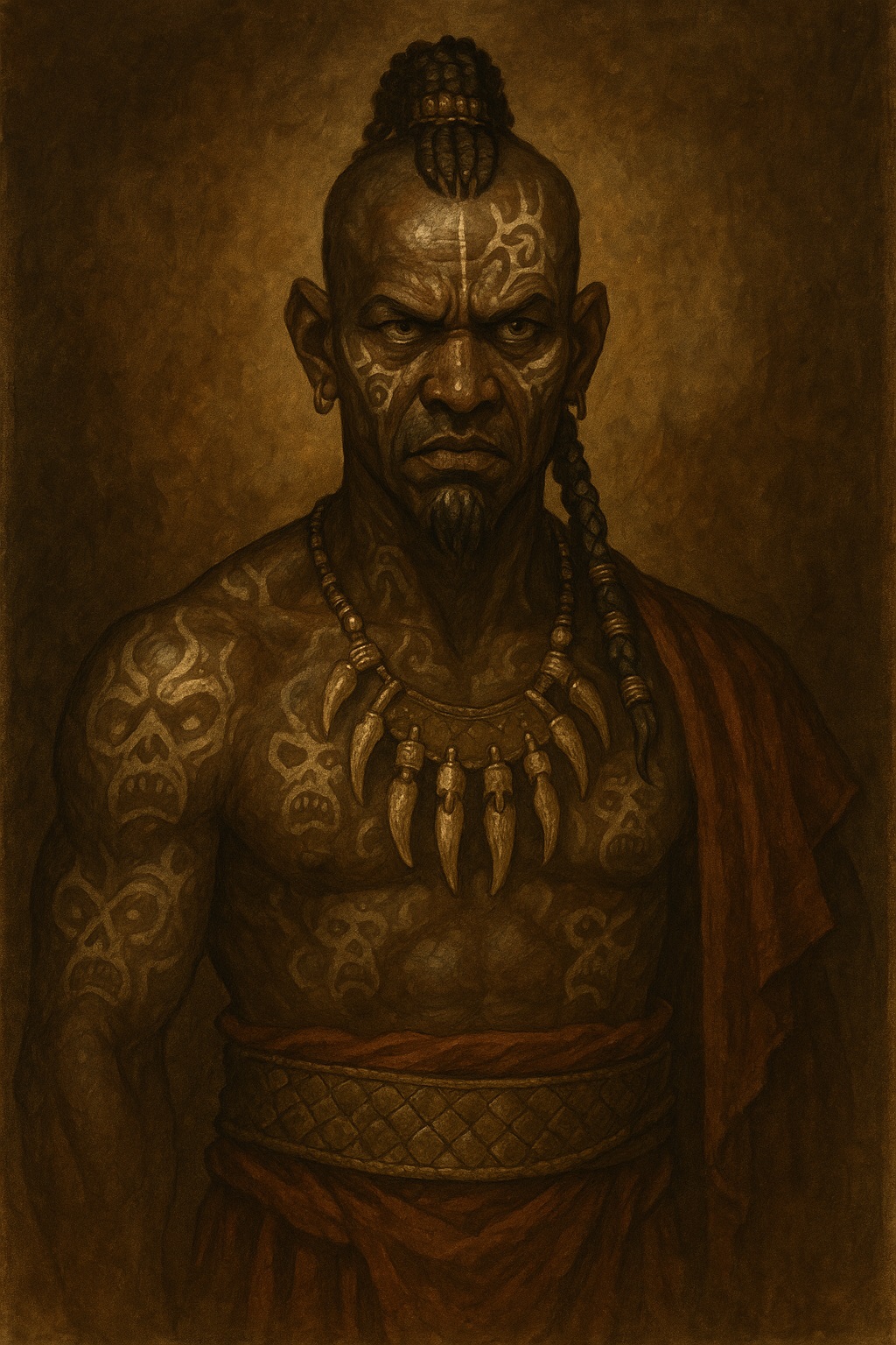 Gam’bosta porte habituellement un pectoral en cuir tanné, décoré de dents vraisemblablement humaines et de griffes de bêtes sauvages. Autour de sa taille, une large ceinture de peaux de serpent enserre un pagne teint de pigments écarlates, et il est rarement vu sans son bâton d’autorité, une lourde massue en bois sombre incrustée d’éclats tranchants d’obsidienne.