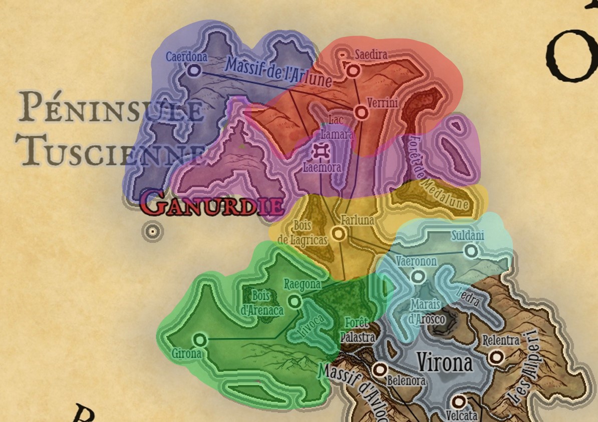 La Ganurdie est une puissante nation maritime de la Péninsule Tuscienne. Si elle n’était pas continuellement prise dans des luttes intestines, elle pourrait facilement s’imposer sur la Mer Ortose. Elle est également en première ligne face aux raids des Dolmates qui profitent des dissensions internes pour harceler ses côtes.
