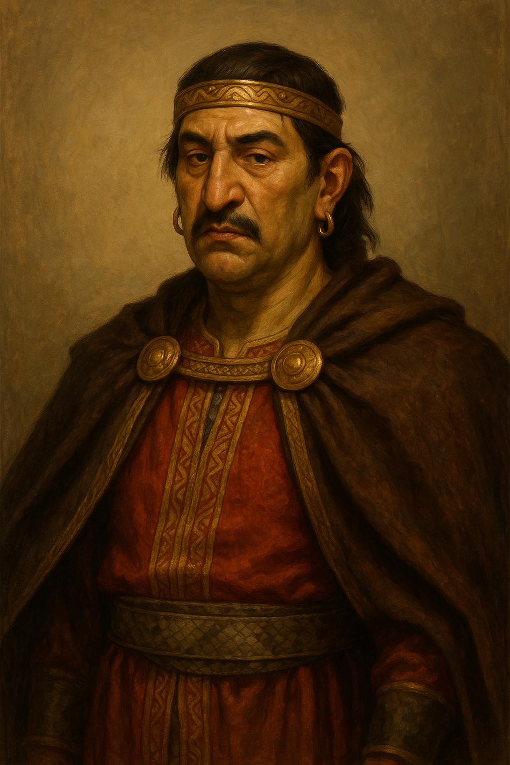 Dalmute d’une cinquantaine d’années, grand et large d’épaules. Il se déplace sans aucune grâce. Il a le nez busqué, les paupières tombantes et le montant fuyant. Jaunâtre de teint, il a de prodigieuses oreilles décollées percées de bijoux en or. Il a les cheveux sombres, mi-courts, et affiche une petite moustache.