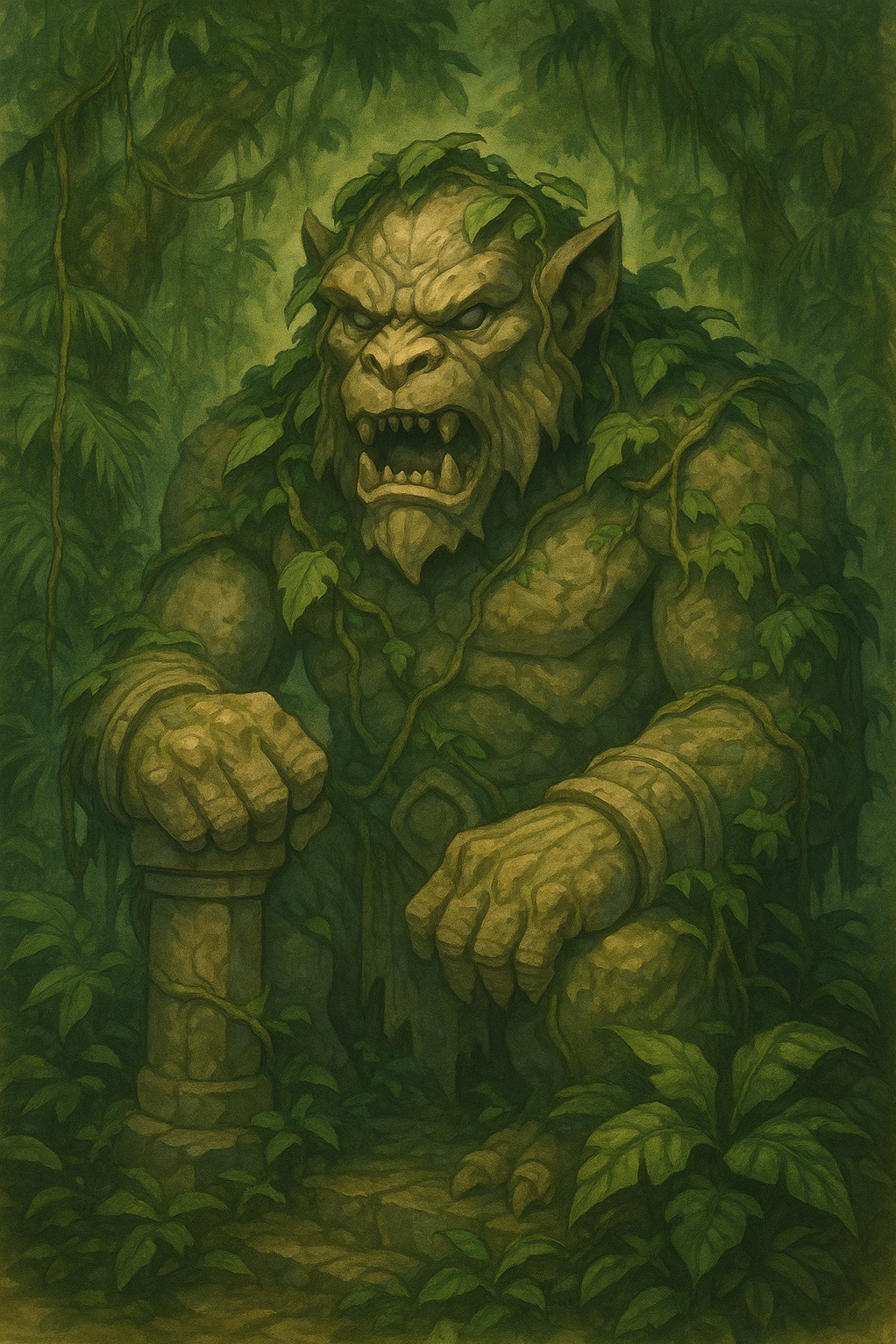 Khulung est représenté comme un géant minéral aux traits bestiaux, mélange de fauve et de grand singe.